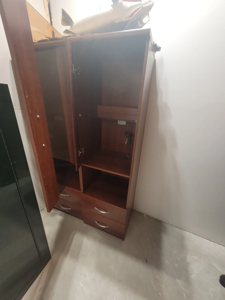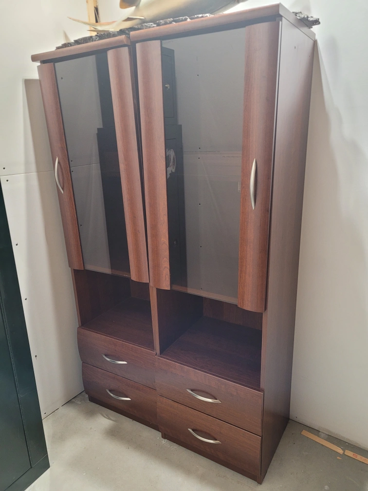 2 Cherrywood color cabinets, both for $70, both have a glass door with a light inside and 2 drawers and a shelf. Can be placed side by side or separately. (cabinets are NOT crooked like it may show, floor is not level and one is pulled out a bit)