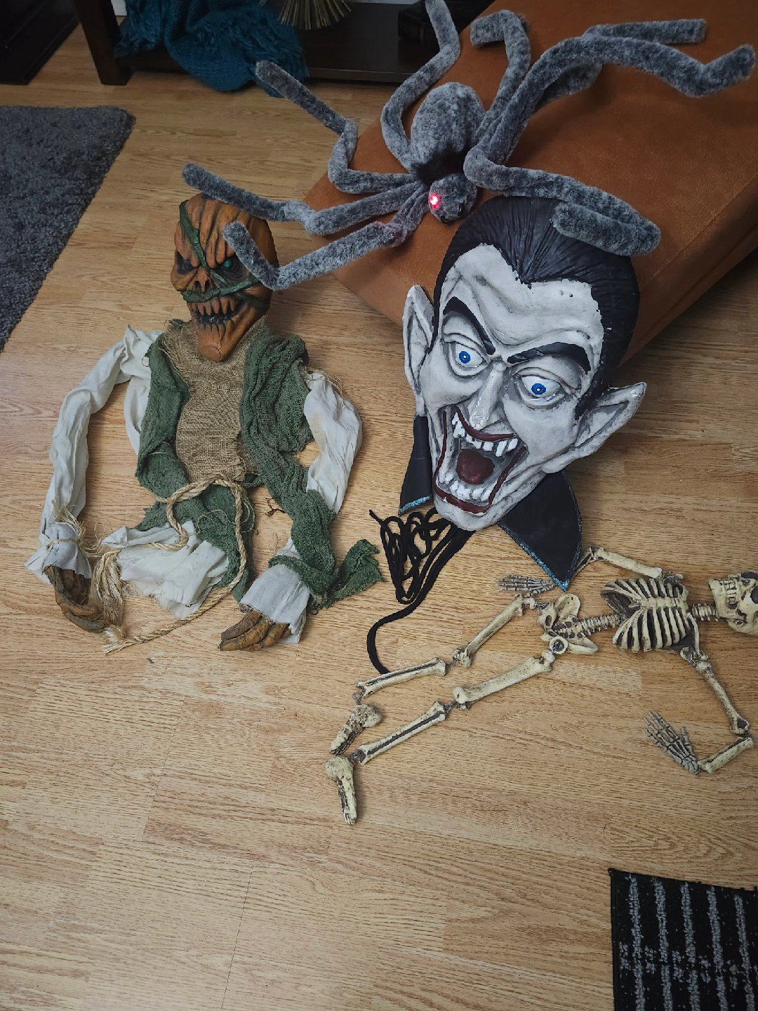 Getting rid of some large outdoor Halloween decorations! Includes a pumpkin scarecrow, a vampire mask, a spider with light-up eyes, and a skeleton