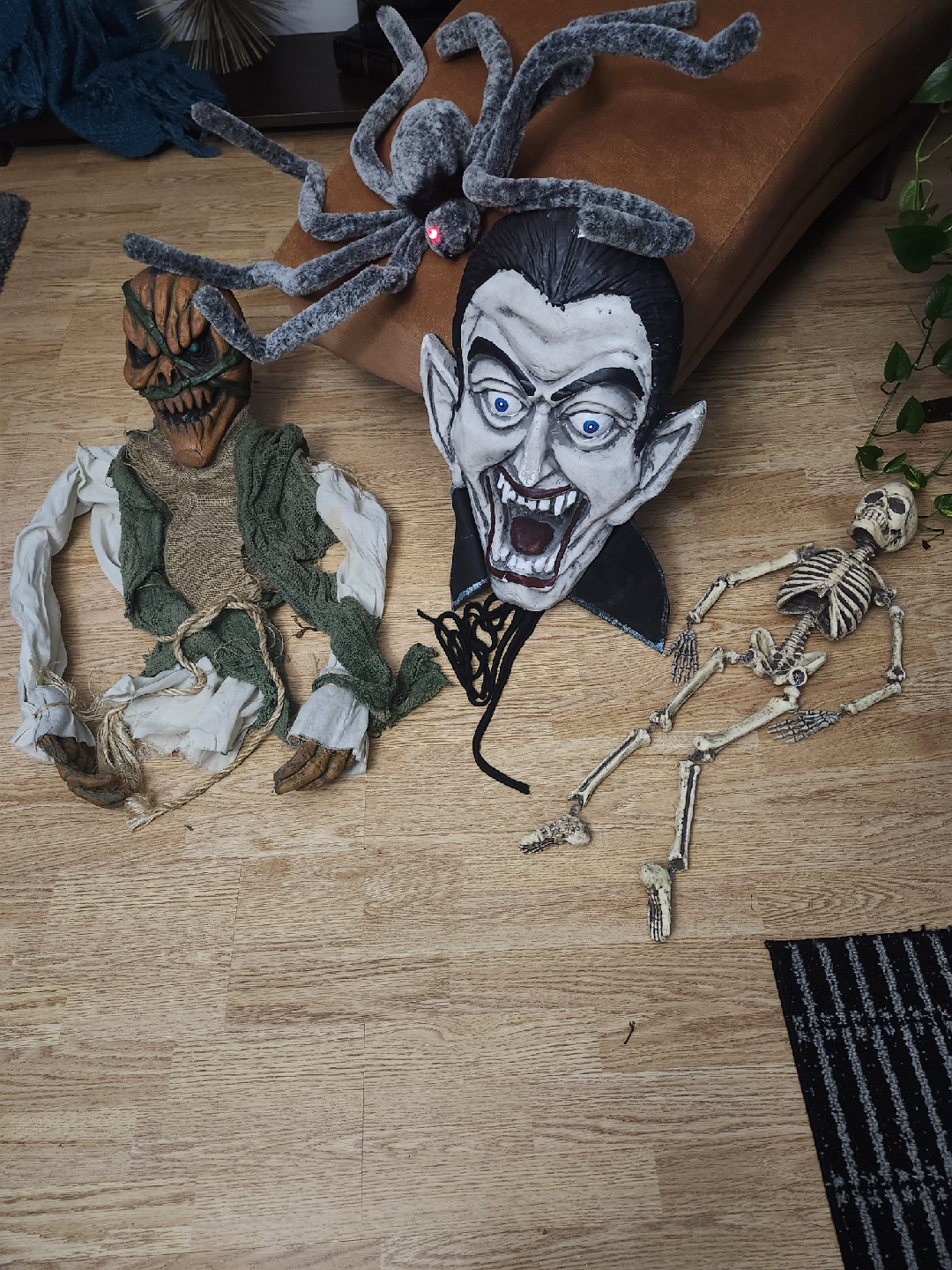 Getting rid of some large outdoor Halloween decorations! Includes a pumpkin scarecrow, a vampire mask, a spider with light-up eyes, and a skeleton