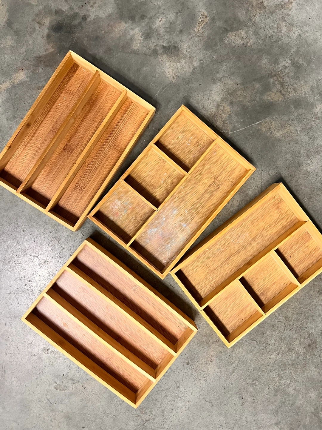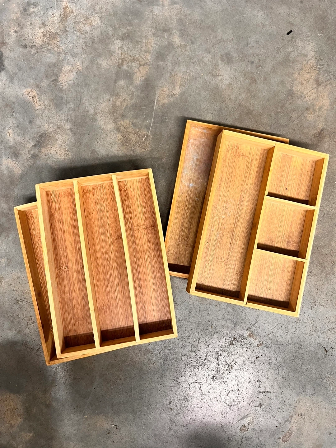 4 bamboo drawer organizers for cutlery and utensils. One organizer has four compartments, and the other has five compartments of varying sizes. Bamboo material.