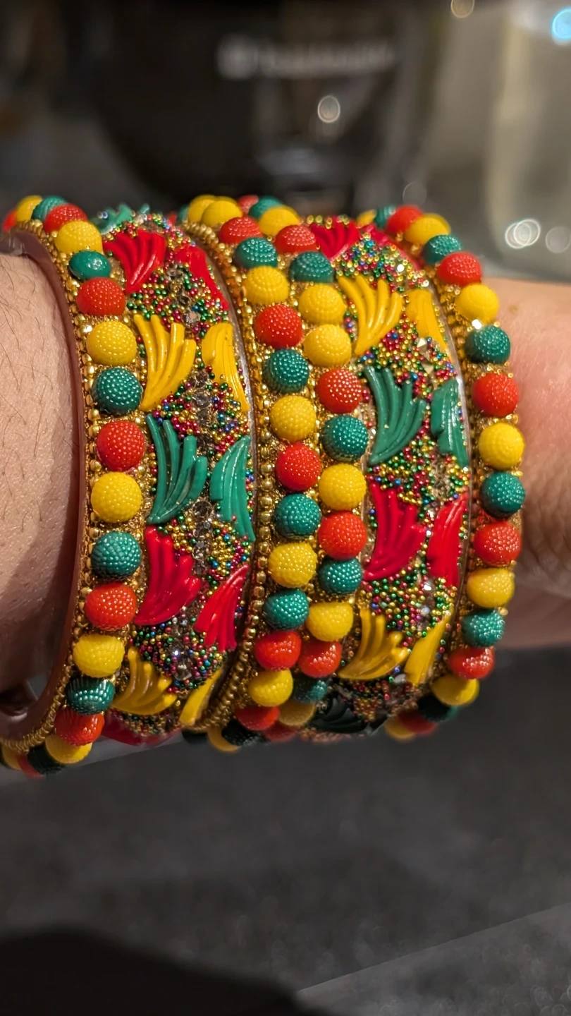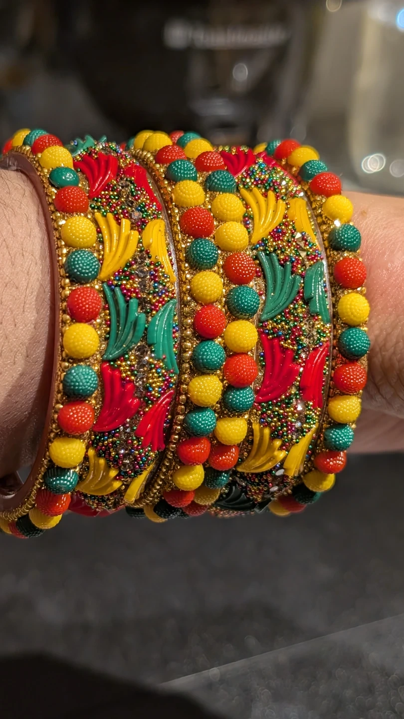 A set of vibrant bangles with colourful beads and glitter accents. Each bangle features a unique embossed design with yellow, red, and green elements. These bangles add a festive touch to any outfit!