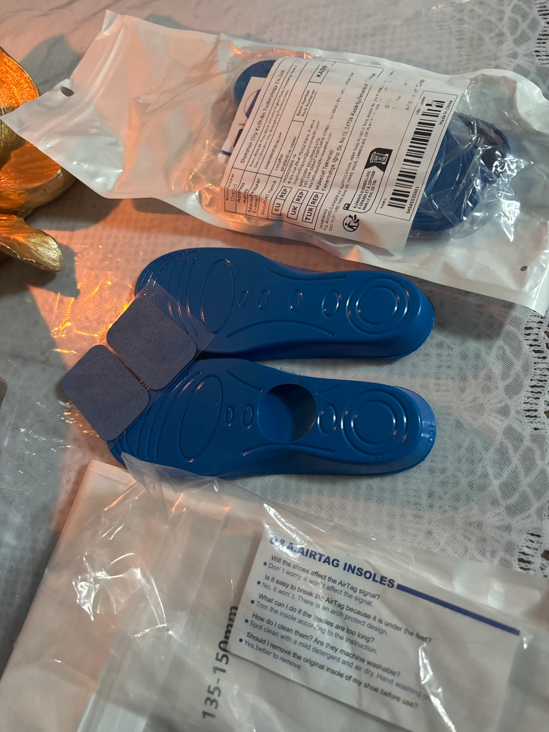 These blue shoe inserts are designed to provide comfort. They're made of a soft material. Includes two adhesive pads. Size 135-150mm.