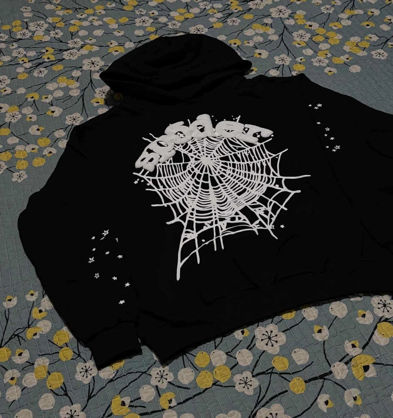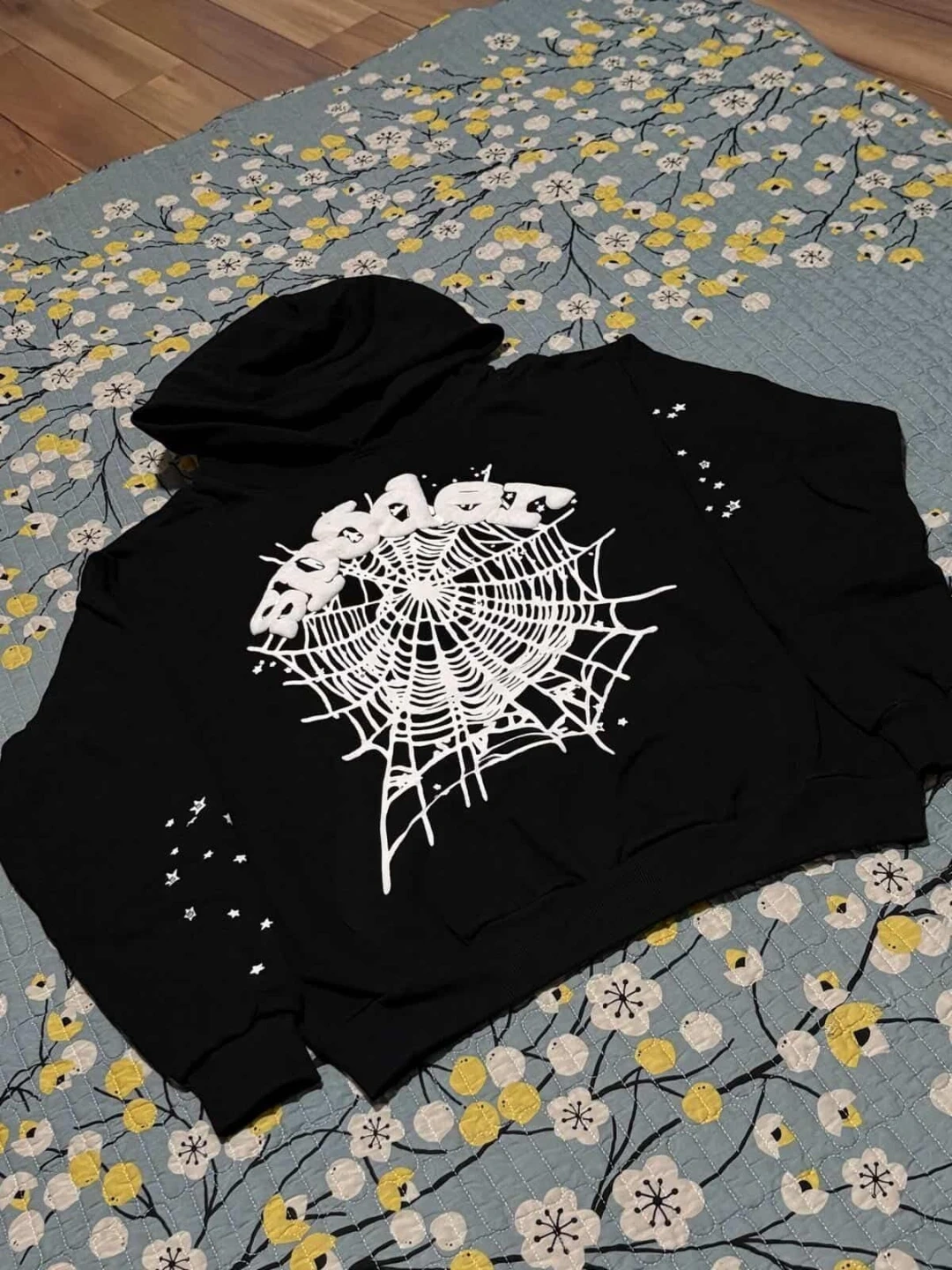 Black hooded sweatshirt featuring a large white spiderweb graphic on the front. It also has small star accents on the sleeves. Made of comfortable fabric.