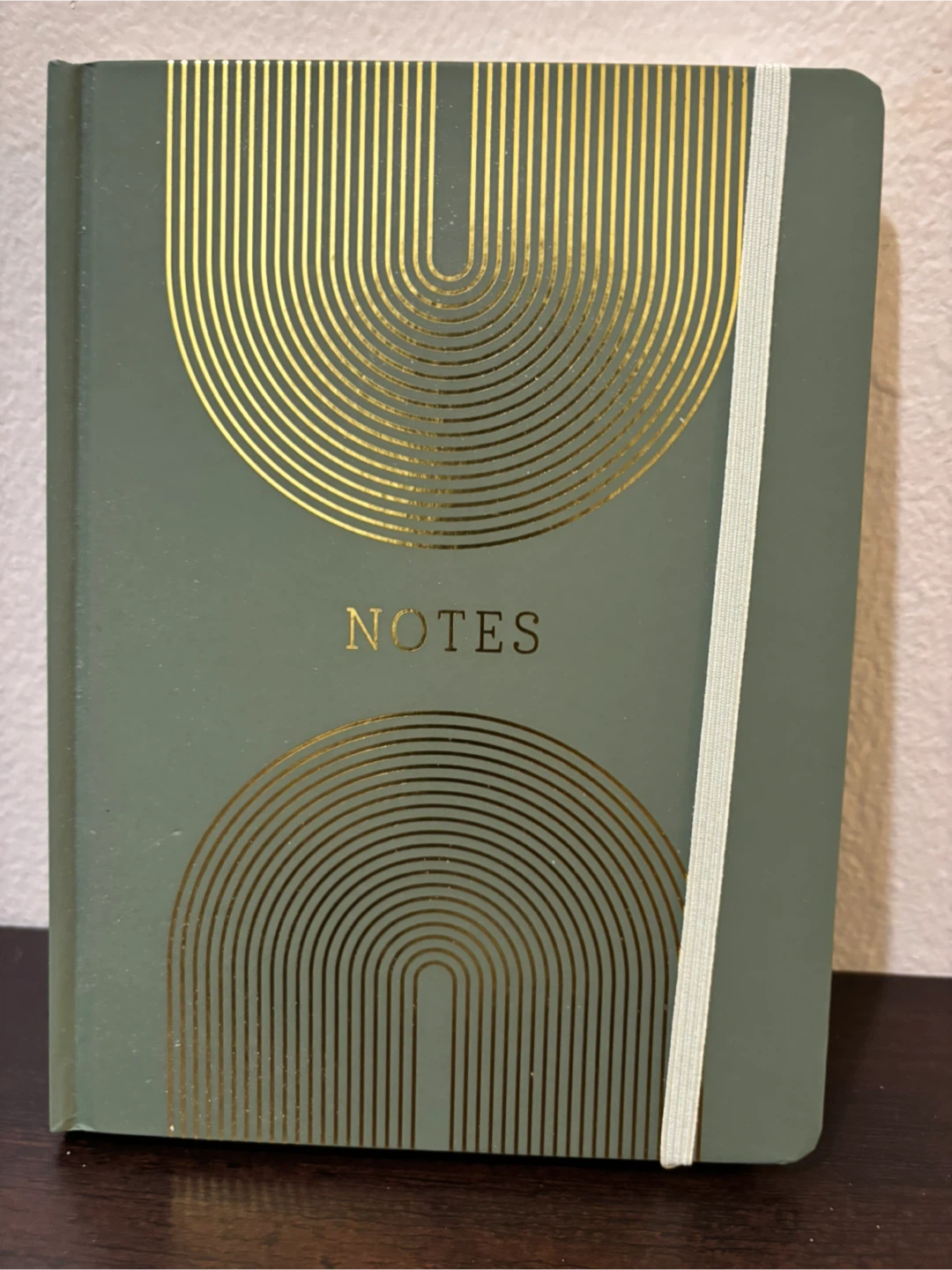 This is a green notebook with gold foil. It features a stylish gold geometric design. The notebook has an elastic band closure and a cream-colored page edge.