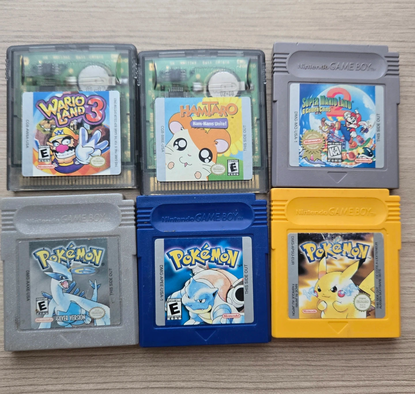 Bundle includes a turquoise and a yellow Game Boy Color and a clear Game Boy Pocket. Comes with six Game Boy cartridges: Wario Land 3, Hamtaro, Super Mario Land 2, Pokemon Silver Version, Pokemon Blue Version, and Pokemon Yellow Version. Also includes a black carrying bag and a magnifying light.