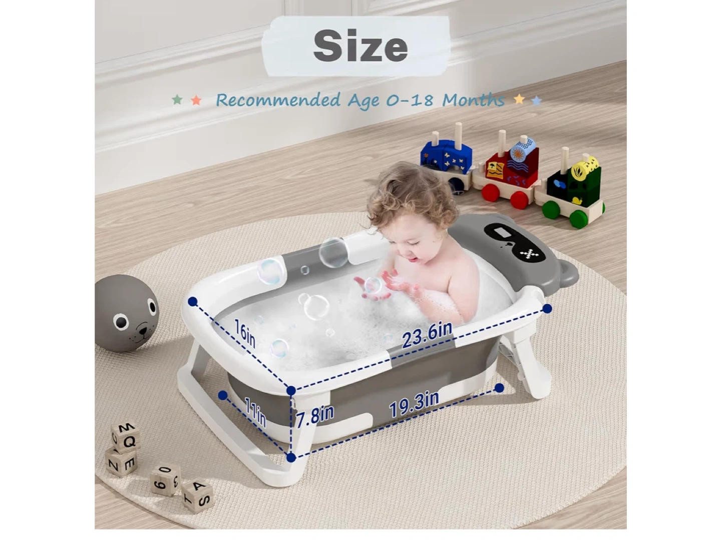 This handy collapsible baby bathtub is designed for convenience. It's perfect for babies aged 0-18 months. The tub measures 23.6in in length and 16in in width when open. It includes a comfortable pad and bath net for your little one.