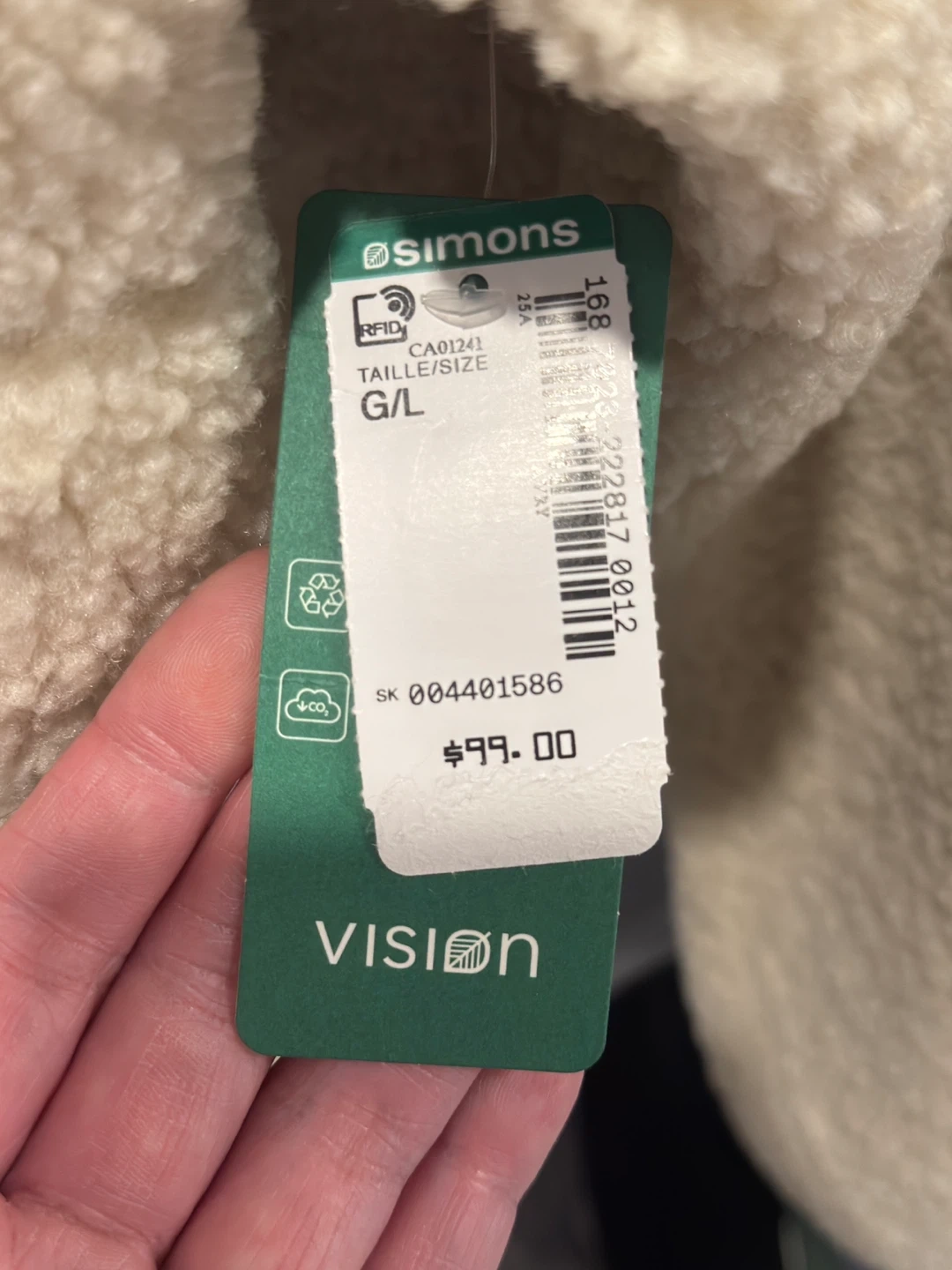 Stay cozy in this cream-coloured fleece jacket from Simons Vision. It's a full zip front with pockets. Size is G/L.