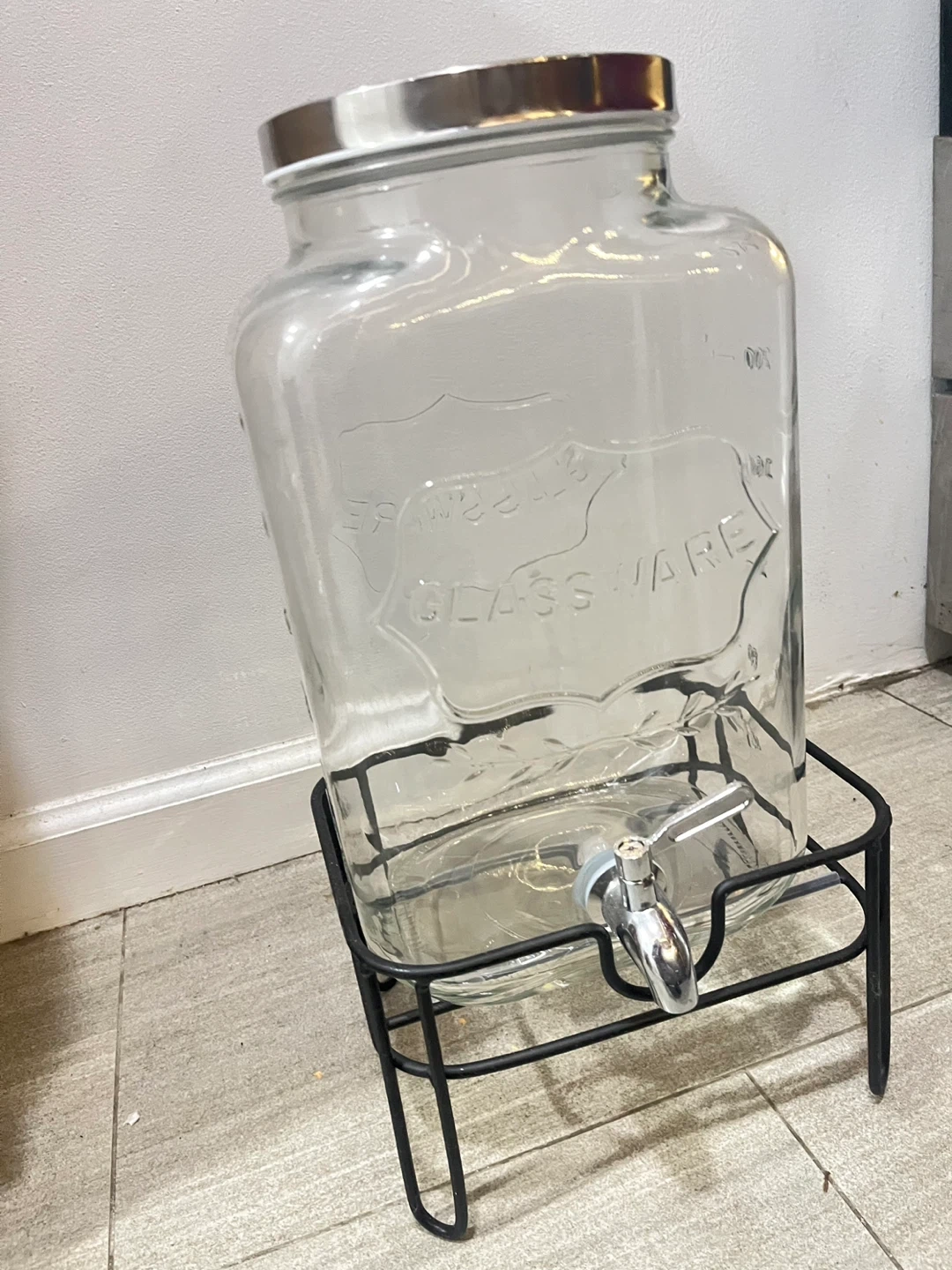 This large glass beverage dispenser is perfect for parties and gatherings. It features a sturdy black metal stand and a chrome spigot for easy serving. Great for serving water, lemonade, or iced tea!