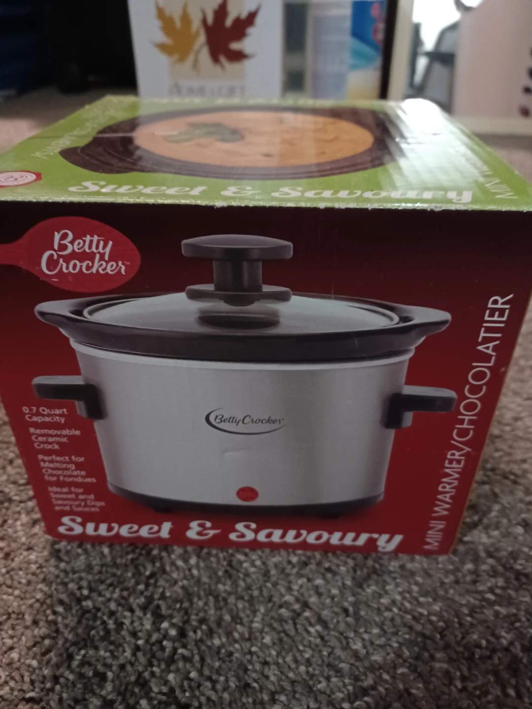 Selling a brand new Betty Crocker Mini Warmer/Chocolatier, still in its original box! It's perfect for melting chocolate or keeping sauces warm. This mini crock is great for fondue and has a 0.7 quart capacity. Ideal for sweet and savoury dips and sauces!
