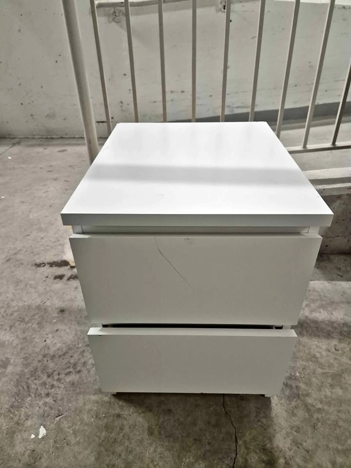 IKEA MALM chest of 2 drawers, which serves as a white bedside table. Please refer to the photos for dimensions. Pick up only.