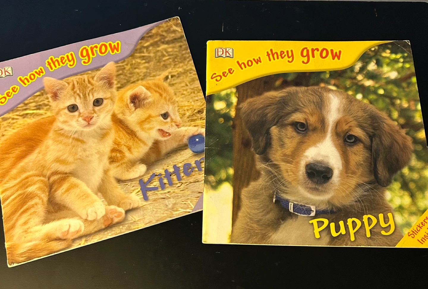 Two books for under 36 months old toddler; one featuring a kitten and the other a puppy. Both books have the title "See how they grow".
