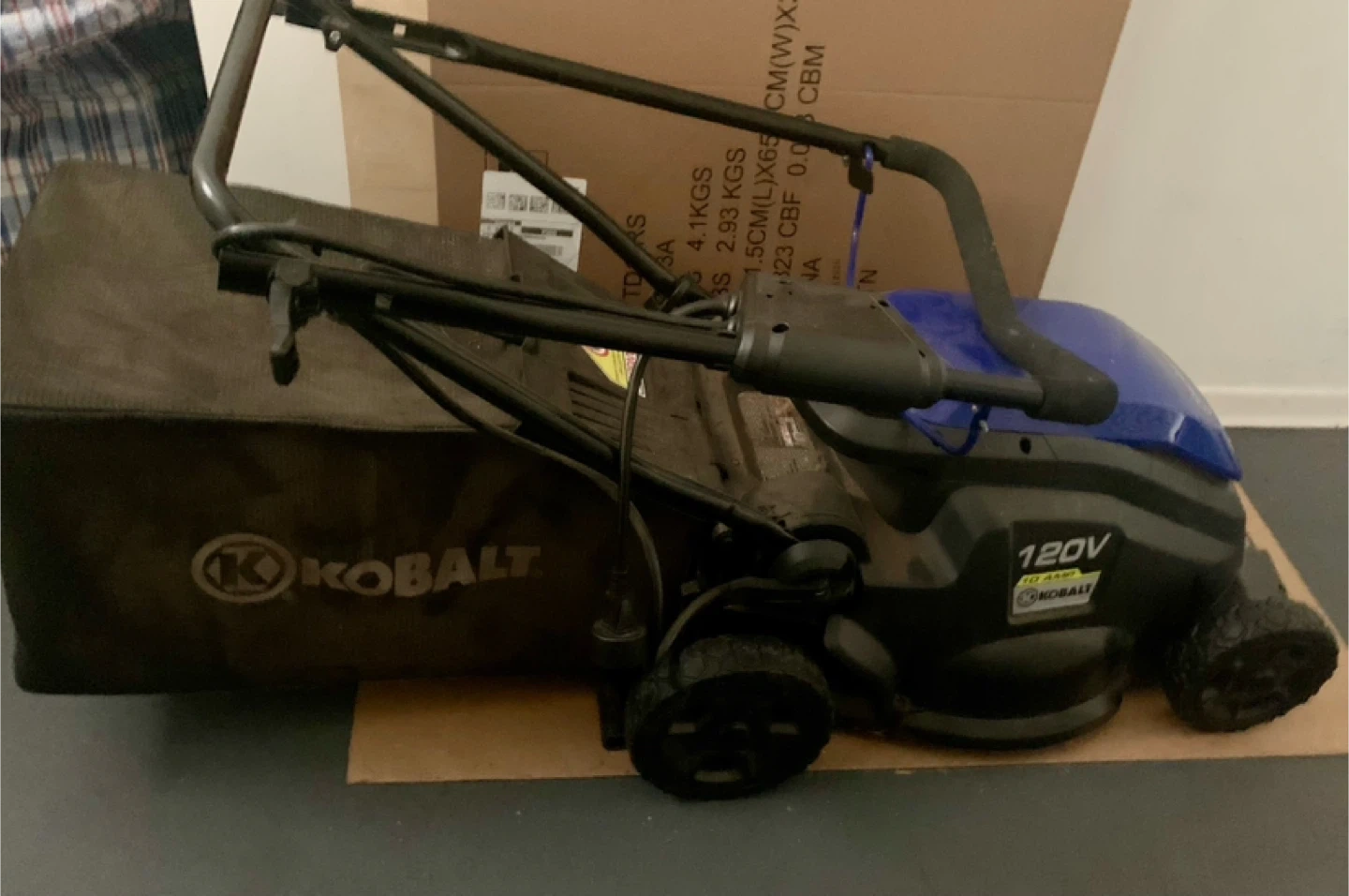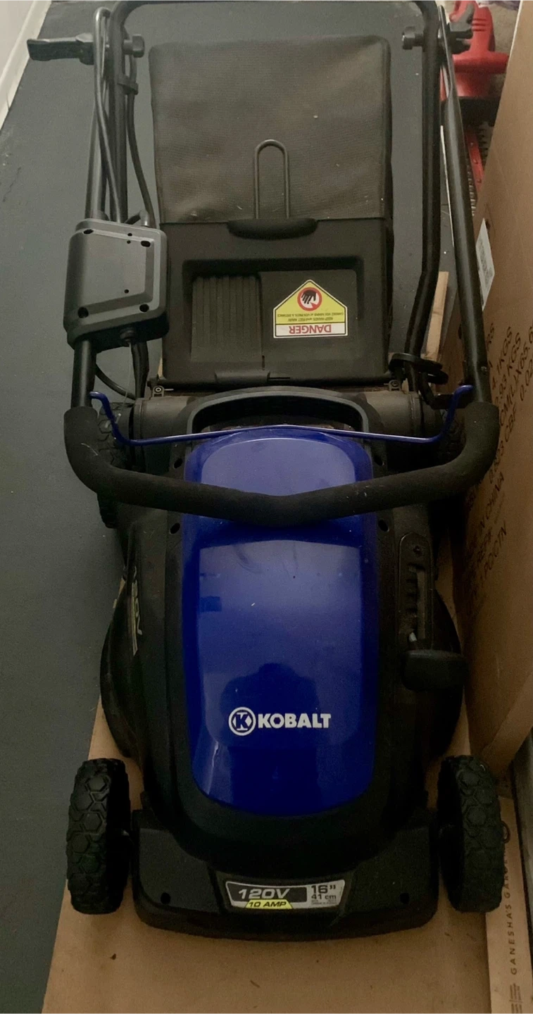 Kobalt 120V cordless electric lawn mower. It's 18 inches wide and includes a mulching bag. It has been used only once. Perfect for maintaining your lawn!