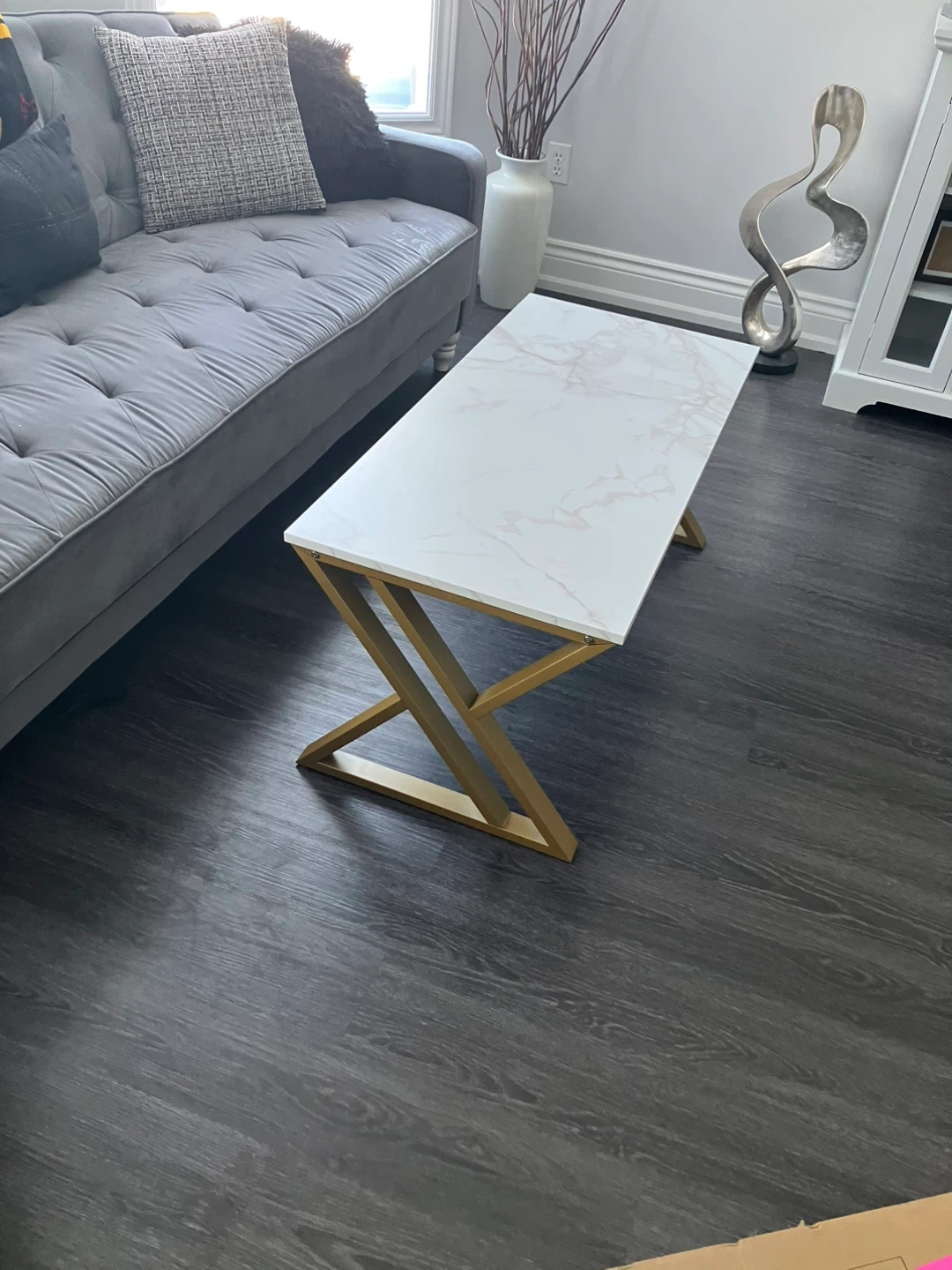 Stylish rectangular coffee table featuring a white marble-look top and a modern gold geometric base. It's a great statement piece for any living room. The tabletop is durable and easy to clean.