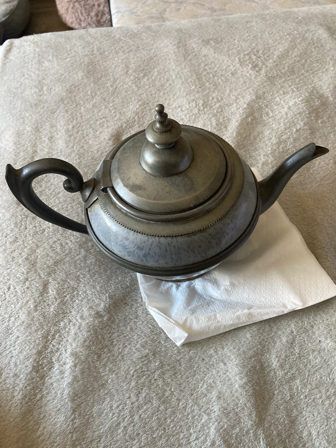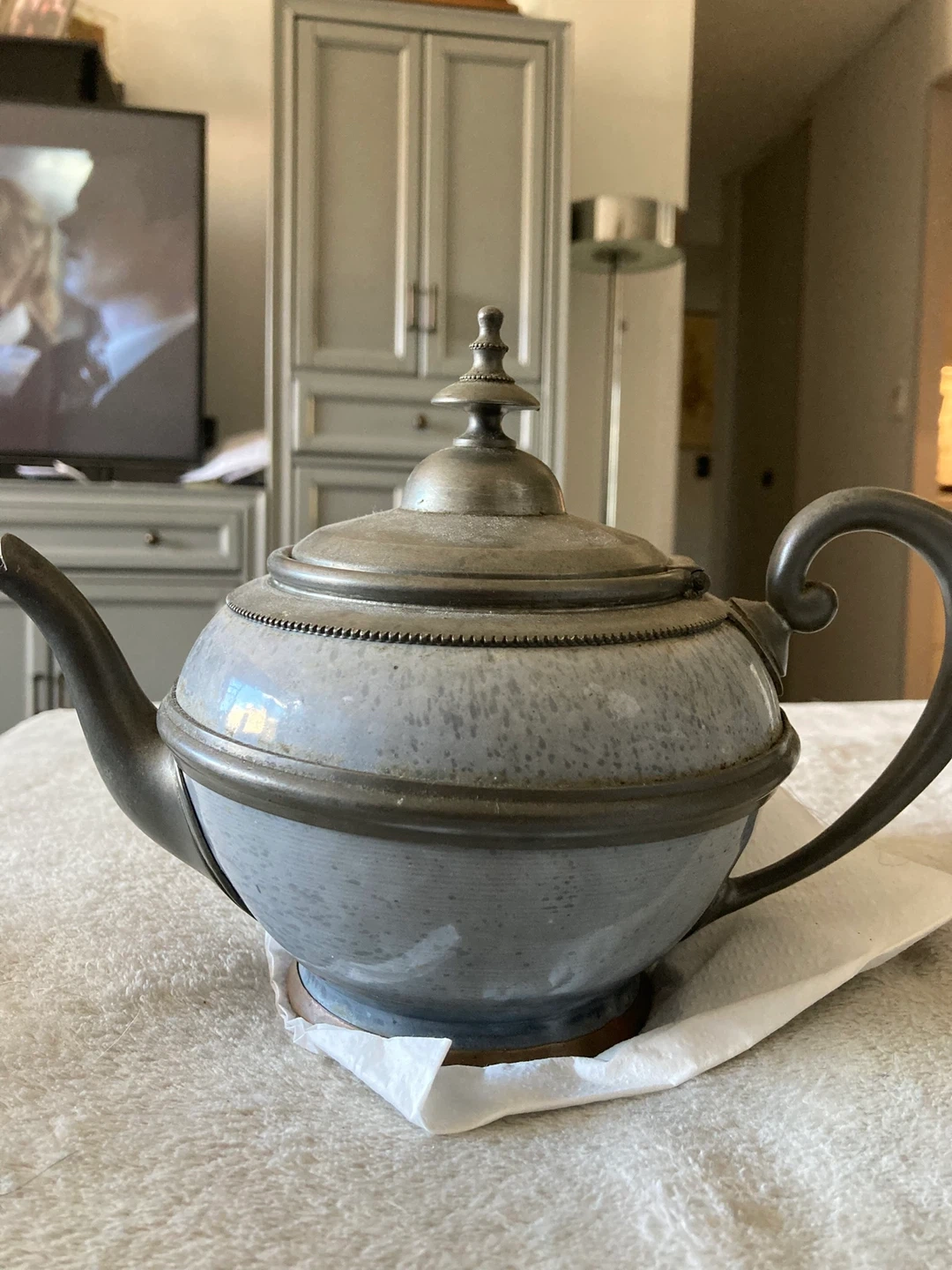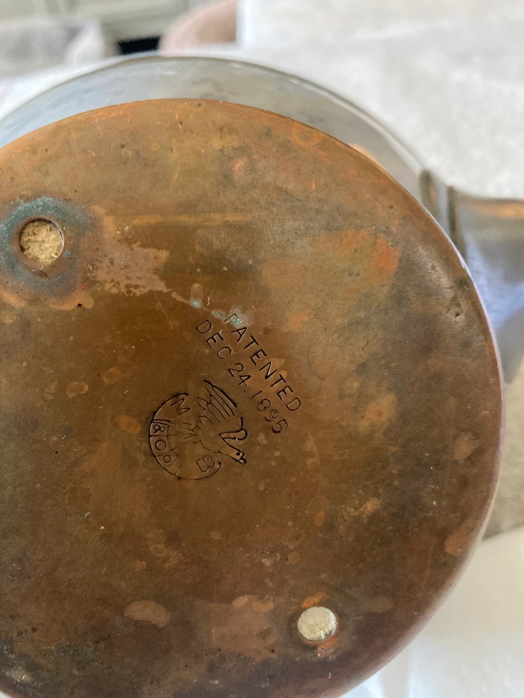 This is a vintage teapot patented on December 24, 1895. It features a classic design with a metal handle and lid. The body has a speckled blue and gray finish.
