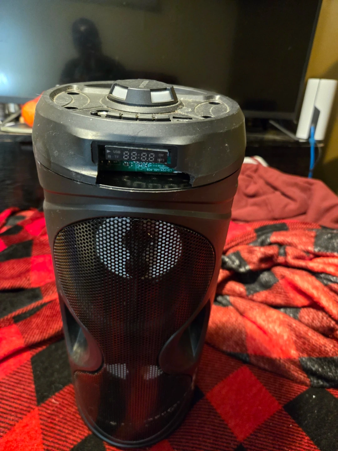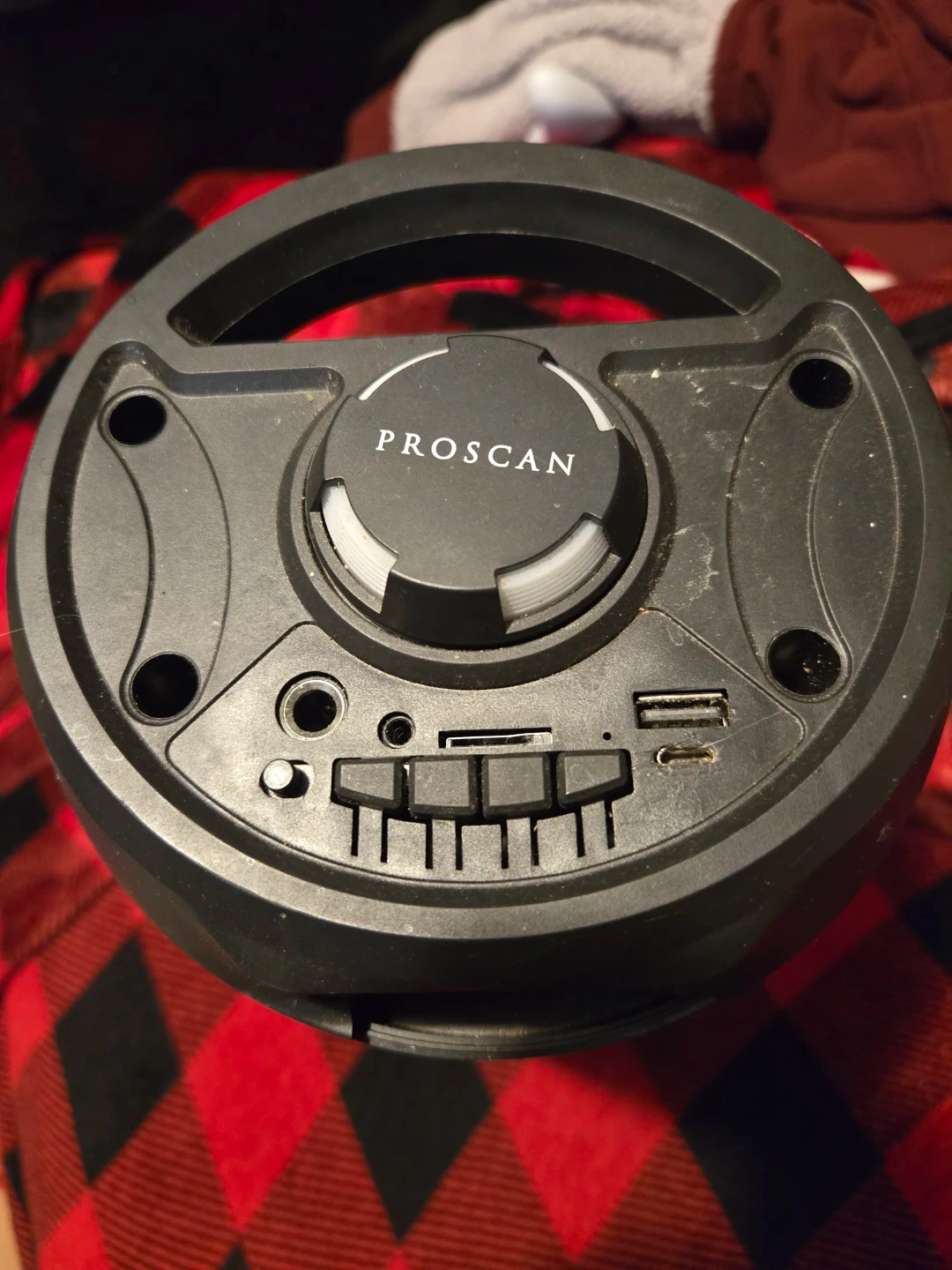 Proscan portable speaker with Bluetooth connectivity. It features a USB port, SD card slot, and auxiliary input for versatile playback options. The unit has a built-in display and controls for easy operation. It's great for playing music anywhere!