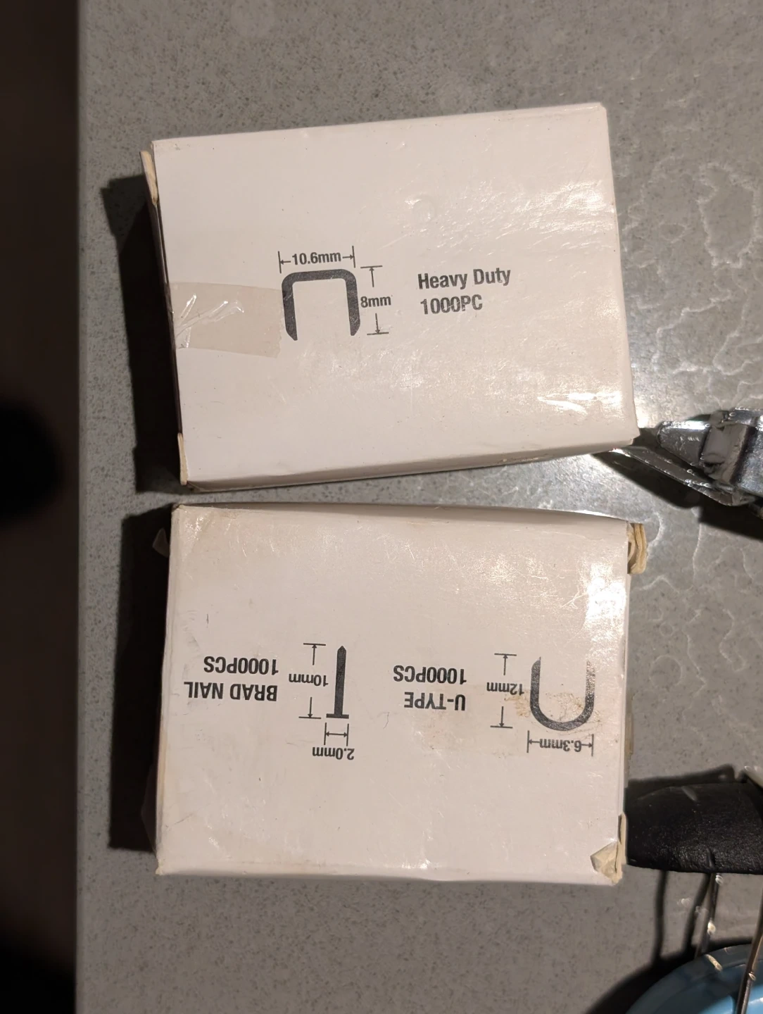 This is a staple gun with a rotary cutter and a staple remover. It includes two boxes of staples: one box of Heavy Duty staples and one box containing U-type and Brad Nail staples. Ideal for upholstery and DIY projects!