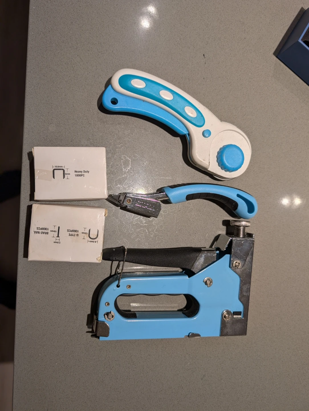 This is a staple gun with a rotary cutter and a staple remover. It includes two boxes of staples: one box of Heavy Duty staples and one box containing U-type and Brad Nail staples. Ideal for upholstery and DIY projects!
