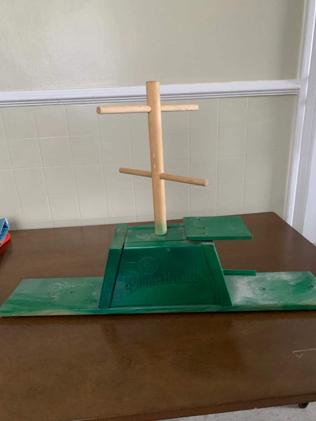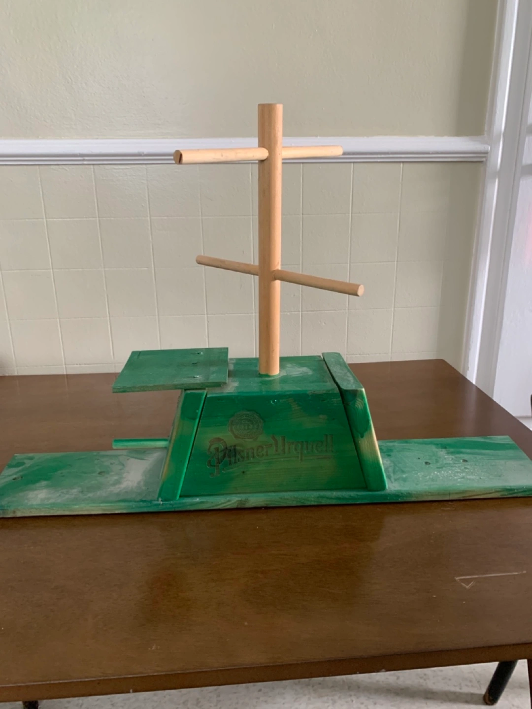 Selling a unique Pilsner Urquell birdhouse! It's green with a wooden perch and a distinctive design. Great for adding a touch of character to your garden or patio