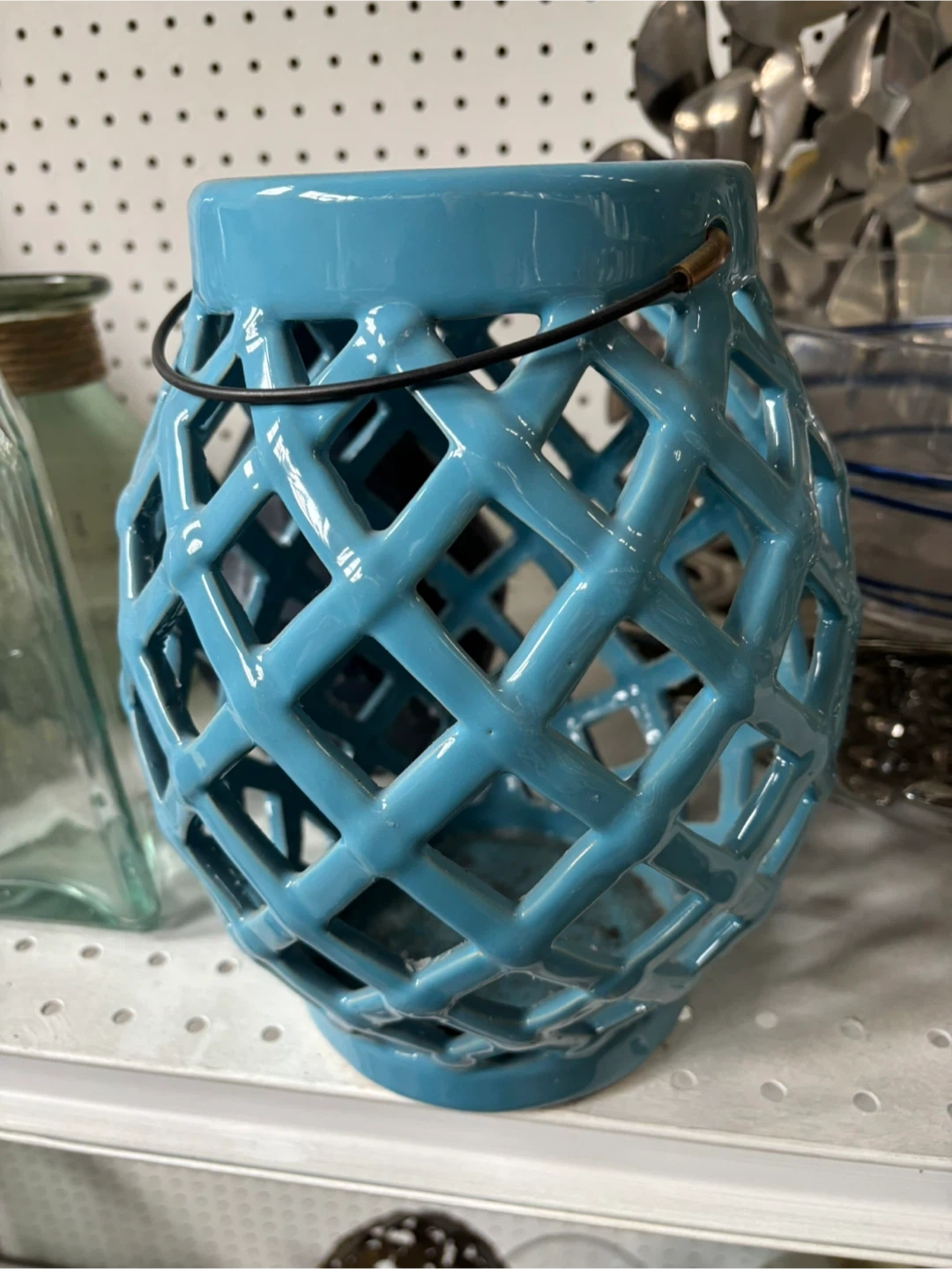 This blue ceramic lantern features a lattice design. It has a metal handle for carrying. Perfect for indoor or outdoor decor!