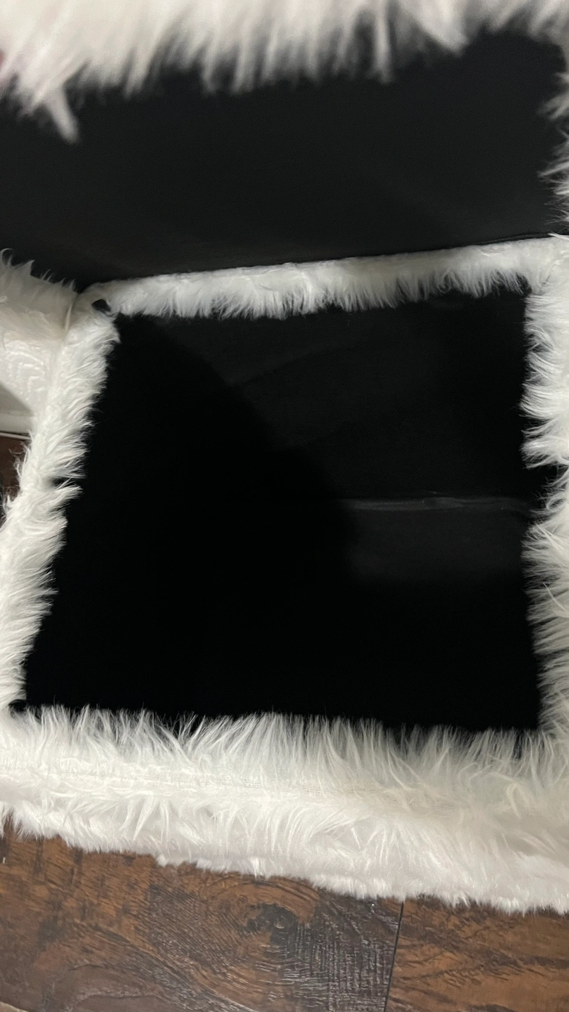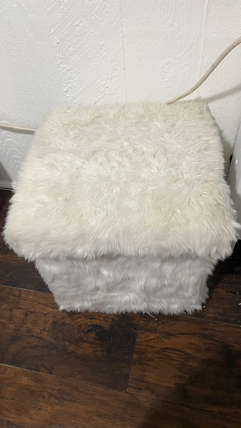 A white faux fur storage ottoman with a black lining. It has a lid that opens for storage. It has a square shape and is made of a soft material.