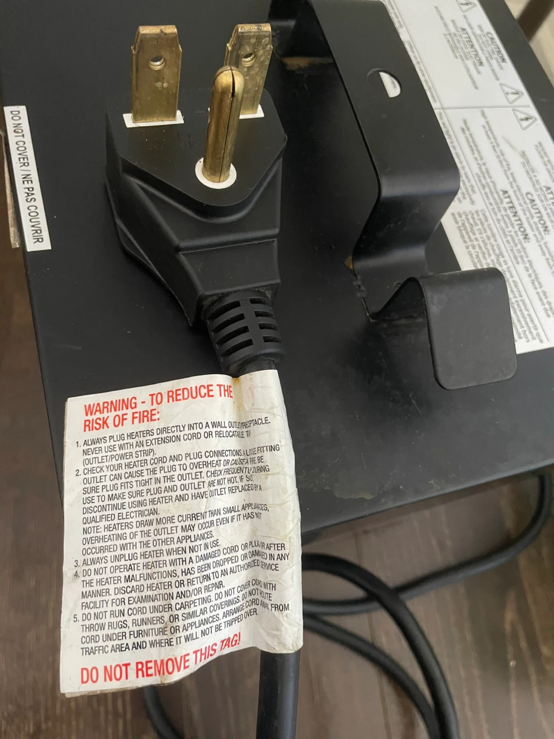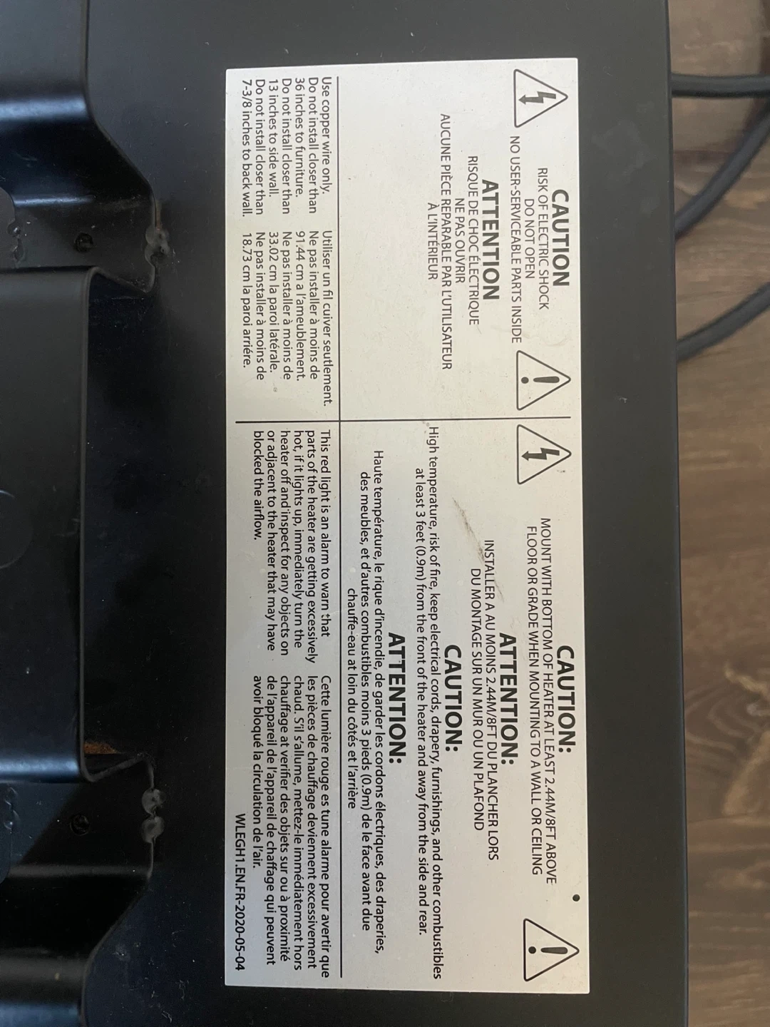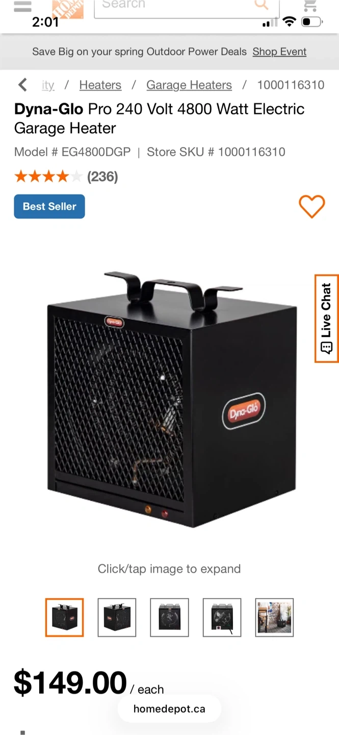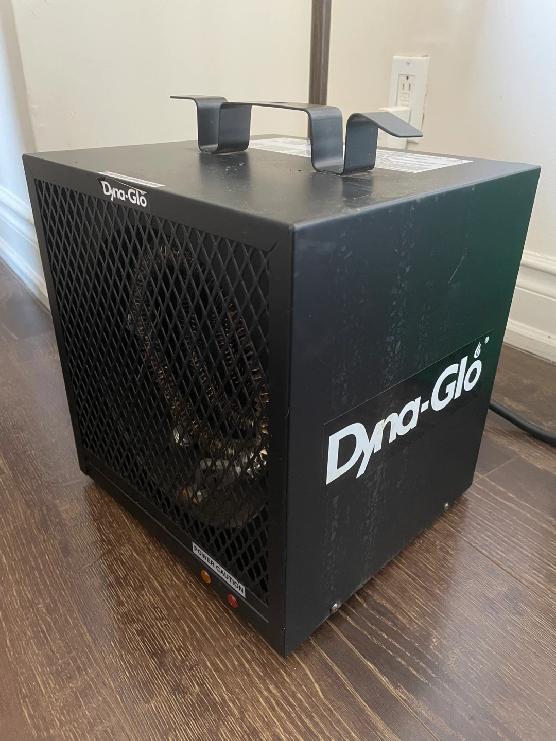 This is a Dyna-Glo Pro electric garage heater. It's 240 volts and 4800 watts. The unit has a black metal housing with a carrying handle. It's designed for garage heating. Power caution light is visible on the front.