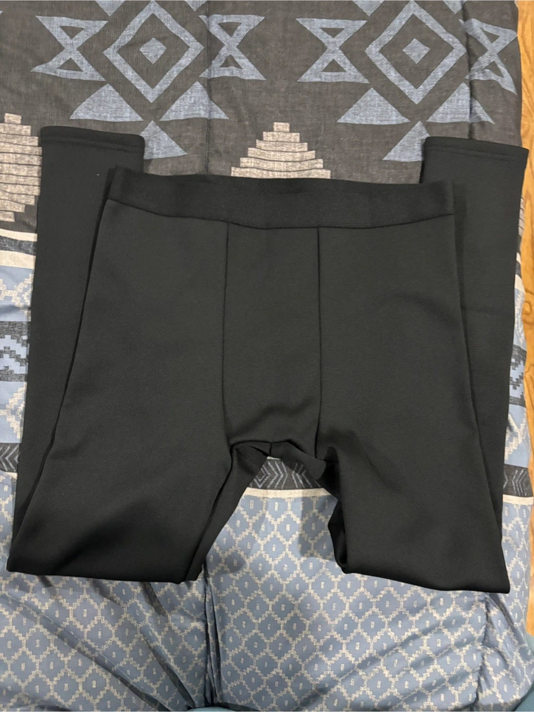 These are black leggings with a soft, fuzzy lining for extra warmth. They've got a comfortable elastic waistband. Perfect for cooler days!