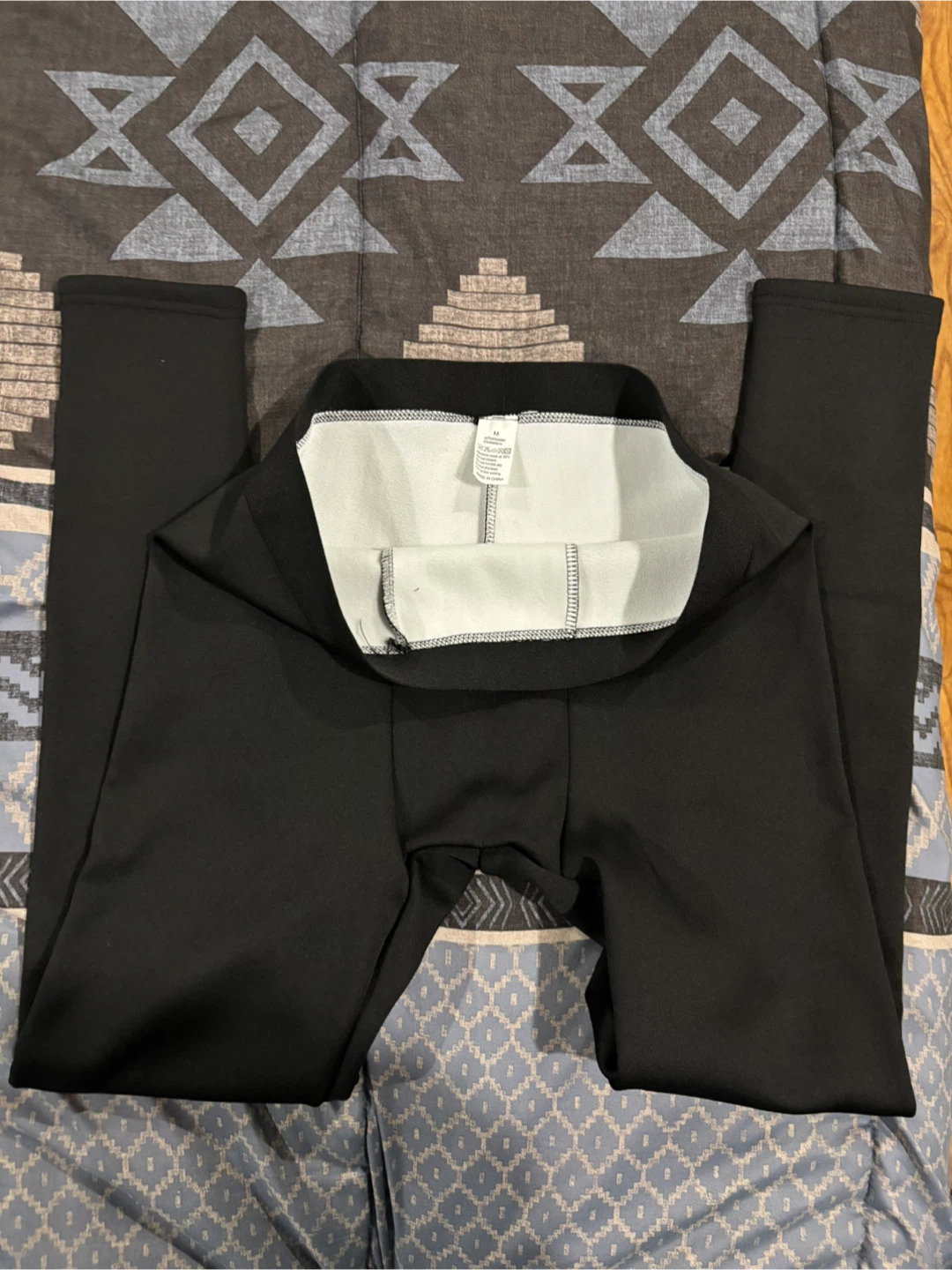 These are black leggings with a soft, fuzzy lining for extra warmth. They've got a comfortable elastic waistband. Perfect for cooler days!