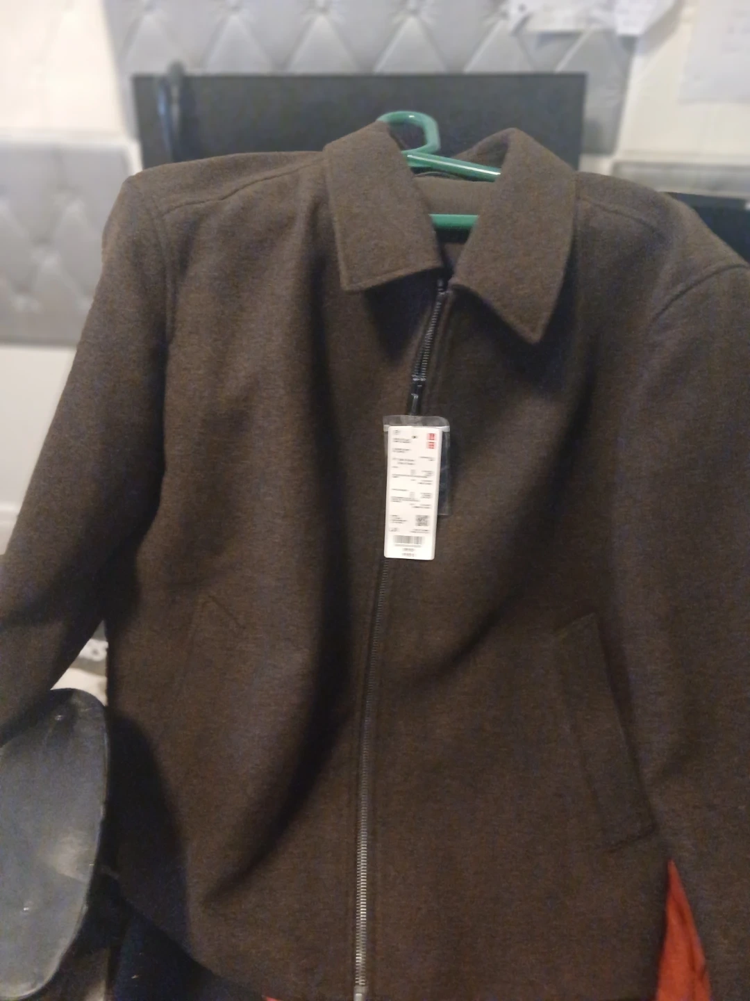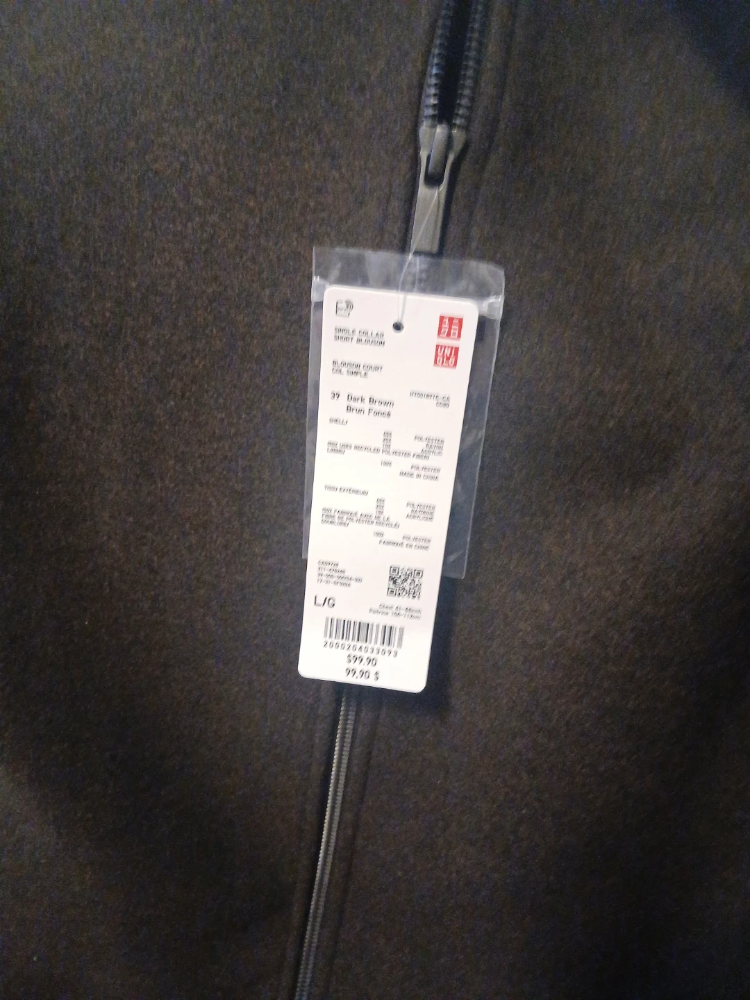 This UNIQLO jacket is a size L/G and features a dark brown colour. It's made with a polyester and acrylic blend. This jacket is suitable for cooler weather.