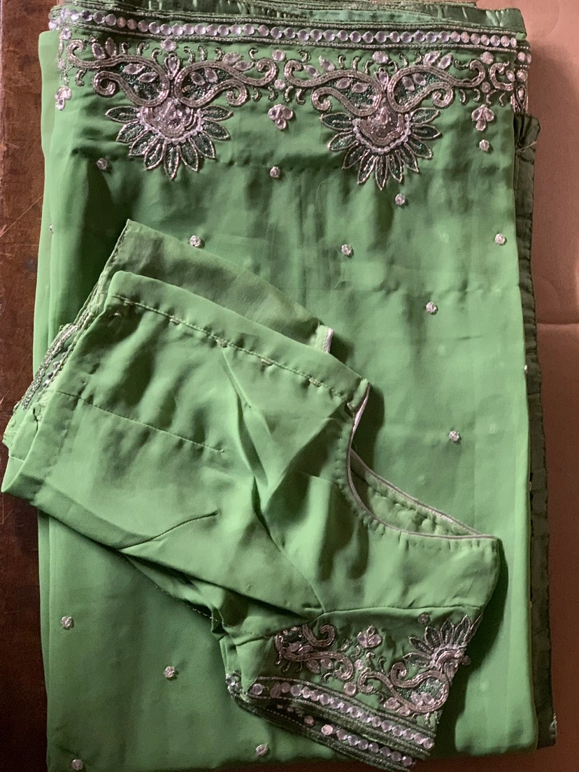 Beautiful green sari with matching blouse. The sari has embroidery and embellishments in a silver colour throughout.
