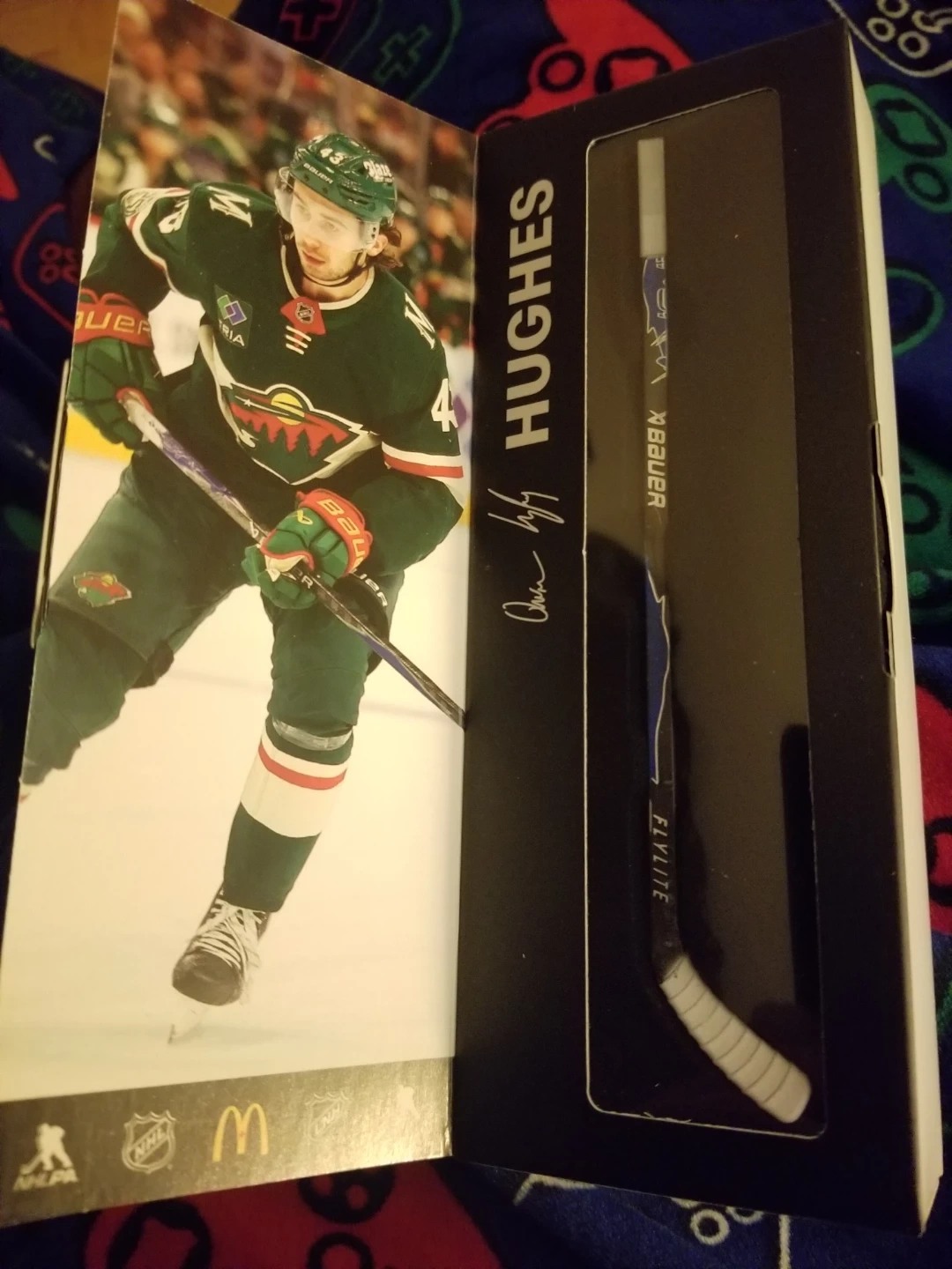 This is a Bauer NHL mini hockey stick featuring an autograph from Hughes. It comes in a display box with a commemorative card. This stick is a great collectible for any hockey fan!