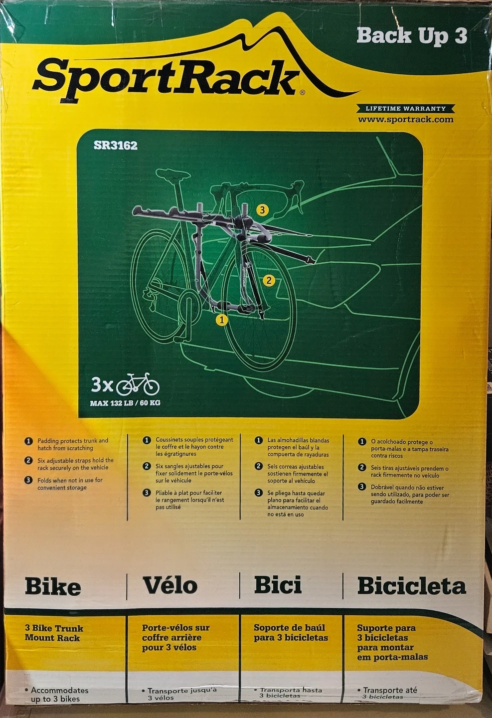 Selling a SportRack Back Up 3 Bike Trunk Mount Rack, model SR3162. It can accommodate up to 3 bikes and has a maximum weight capacity of 132 lbs (60 kg). The rack features padding to protect the trunk and six adjustable straps to hold the rack securely to the vehicle. It also folds flat for convenient storage!