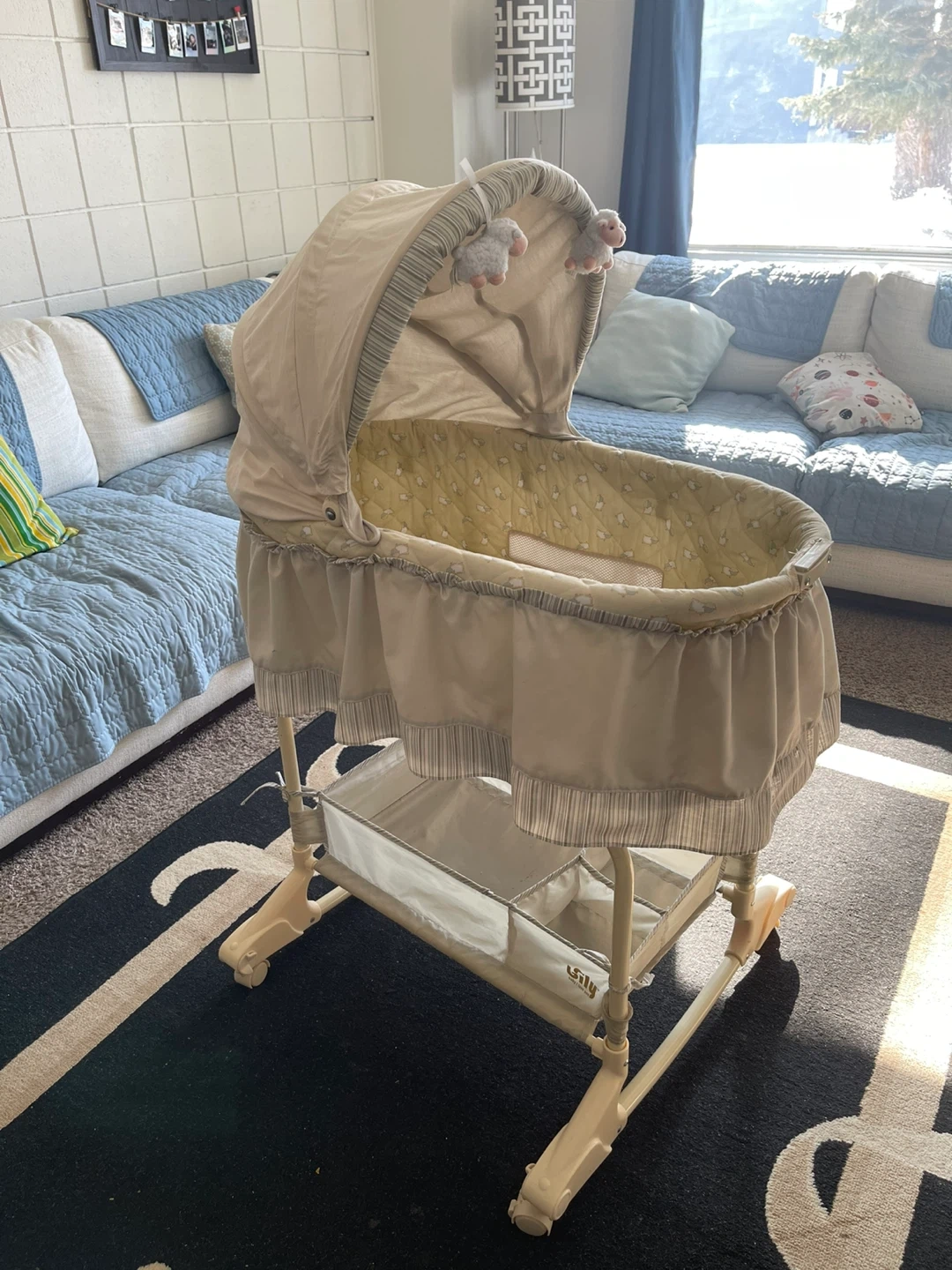This baby bassinet is in a neutral beige and green colour. It has a canopy and includes a mattress pad with a fitted sheet. There's also a storage basket underneath. It's on a stand with wheels for easy movement.
