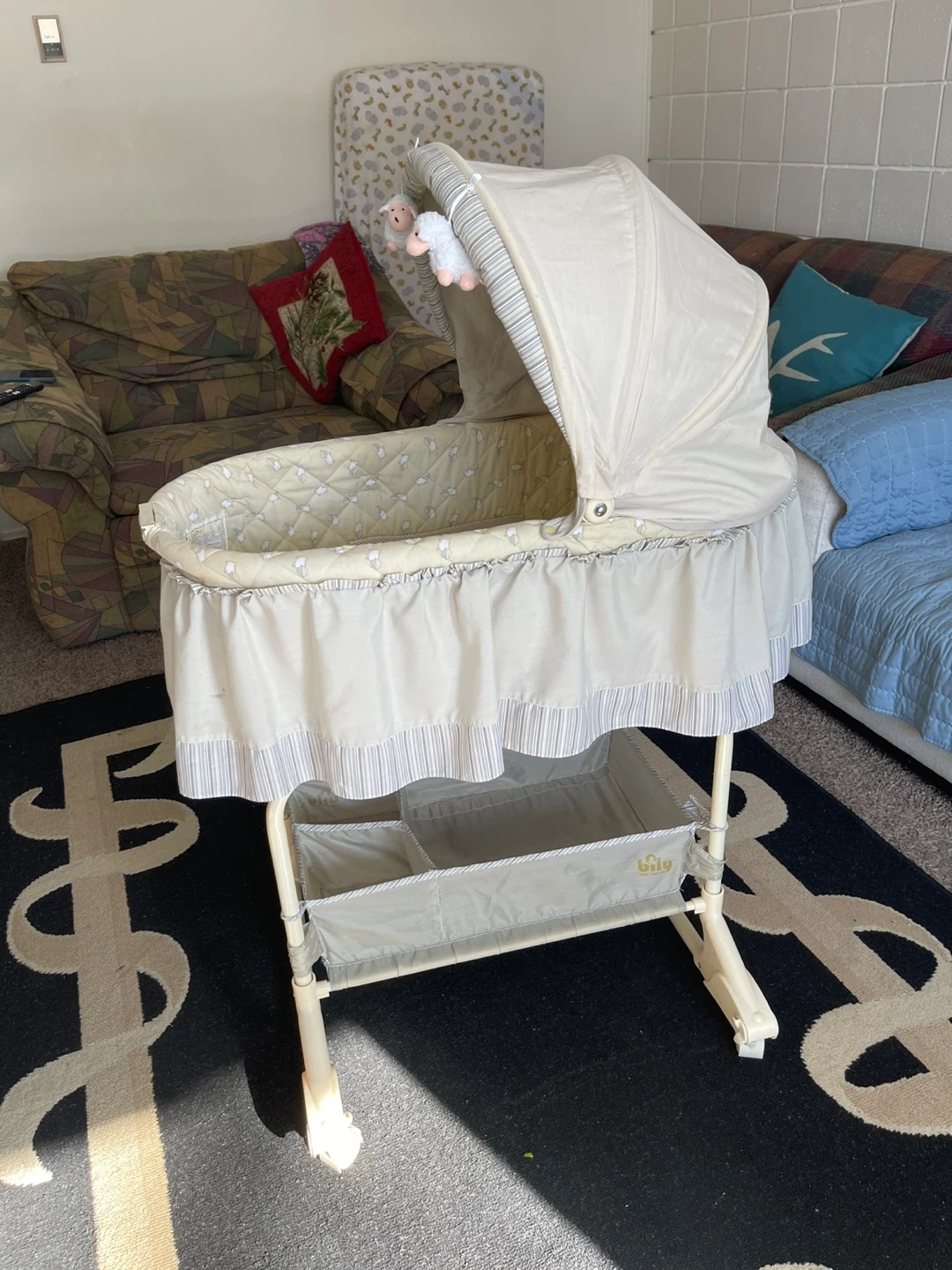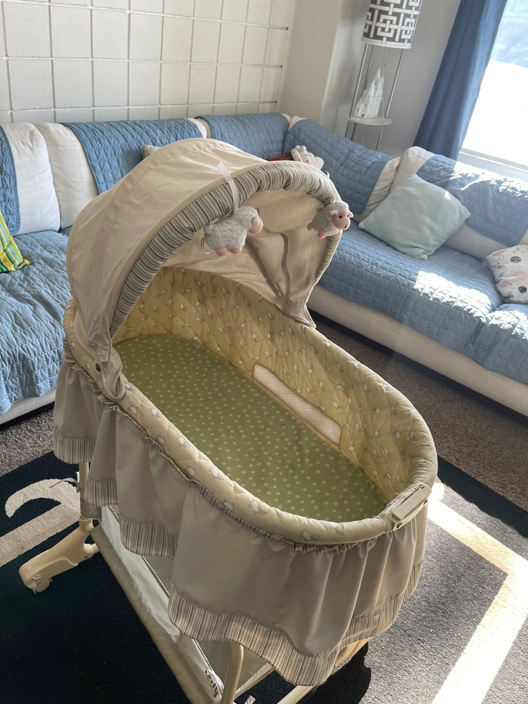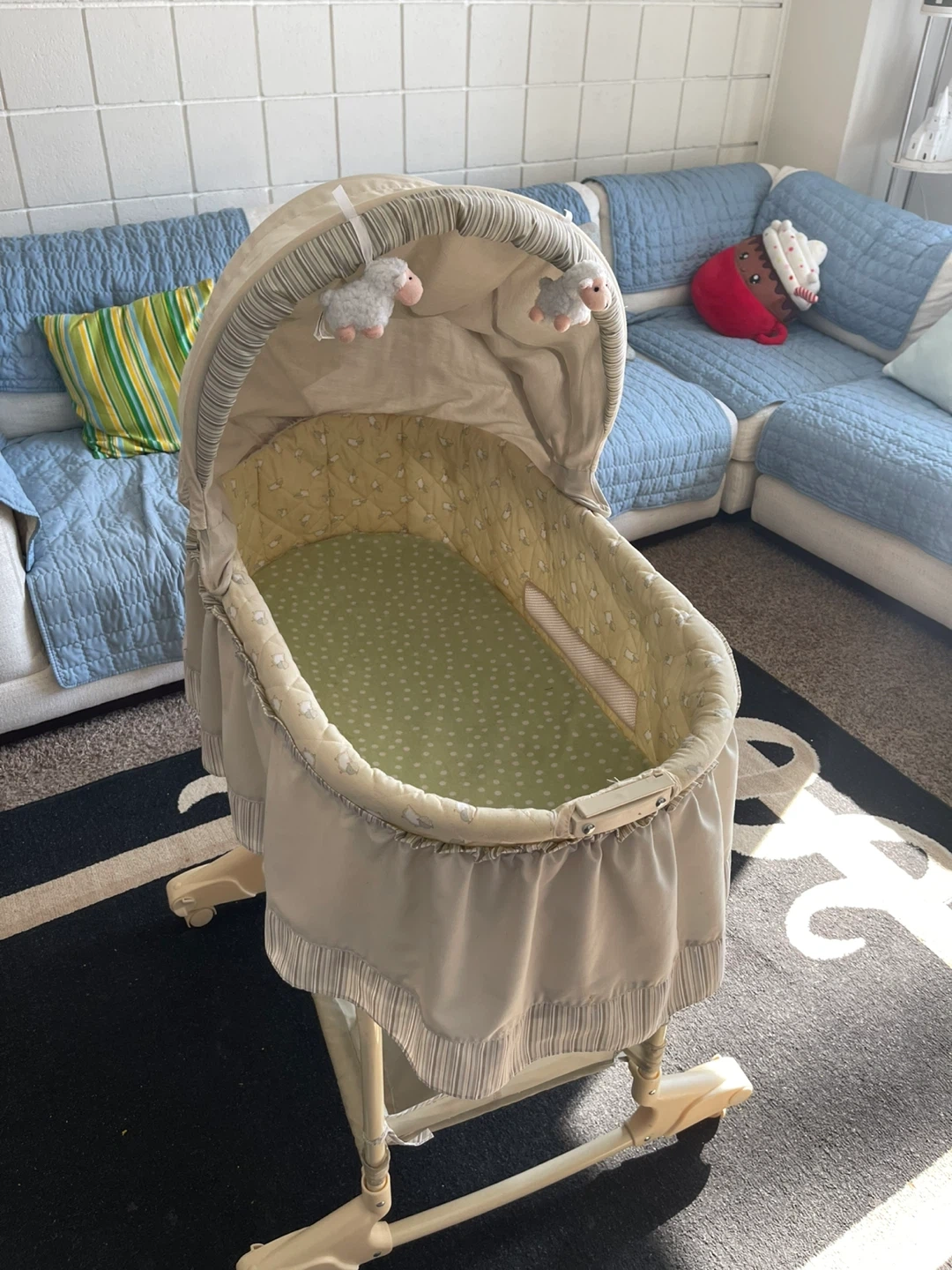 This baby bassinet is in a neutral beige and green colour. It has a canopy and includes a mattress pad with a fitted sheet. There's also a storage basket underneath. It's on a stand with wheels for easy movement.