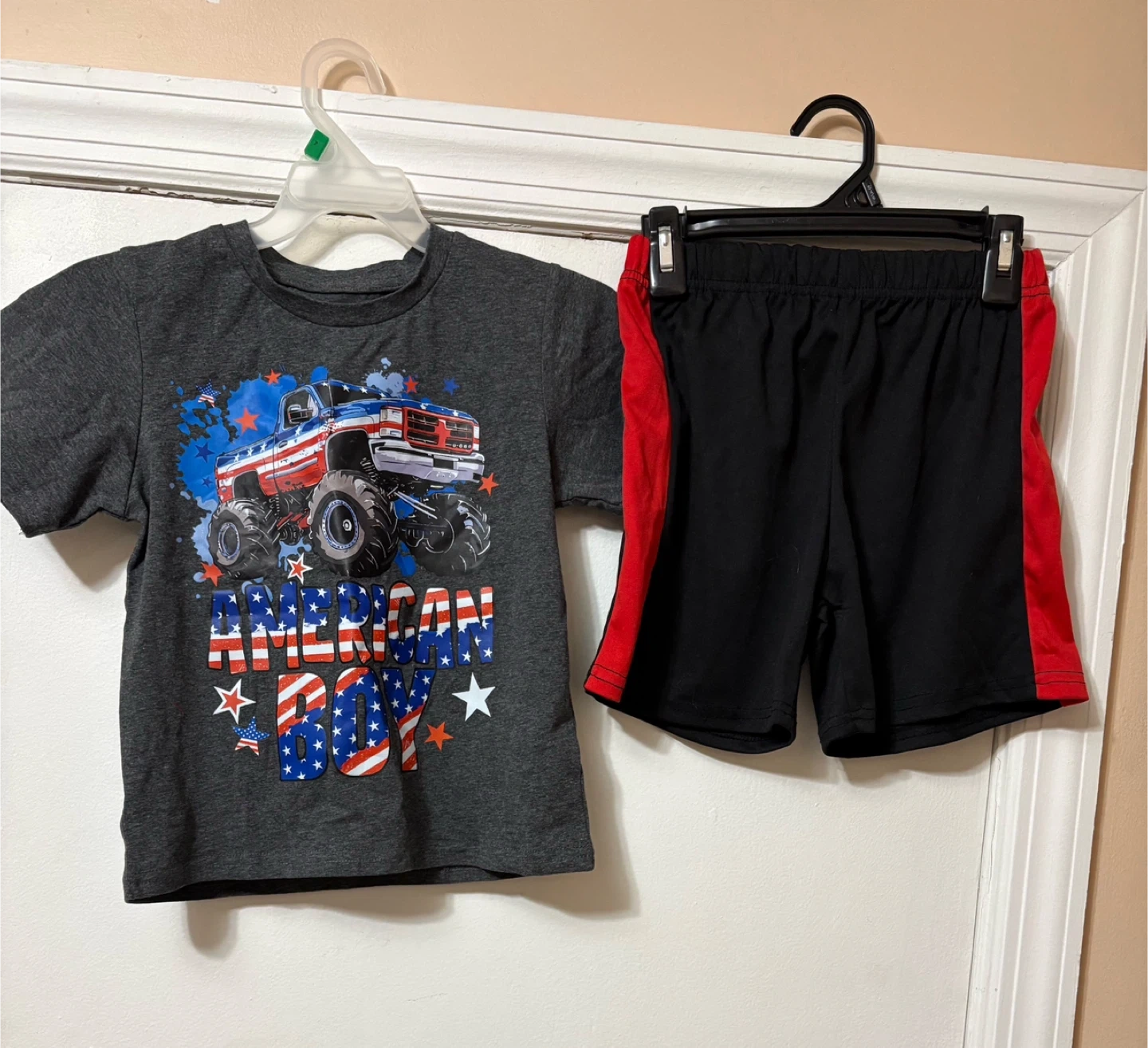 This set includes a charcoal gray t-shirt with a "American Boy" monster truck graphic and black athletic shorts with red side panels. The t-shirt is 100% cotton. The shorts are made of a polyester blend. This outfit is perfect for active play!