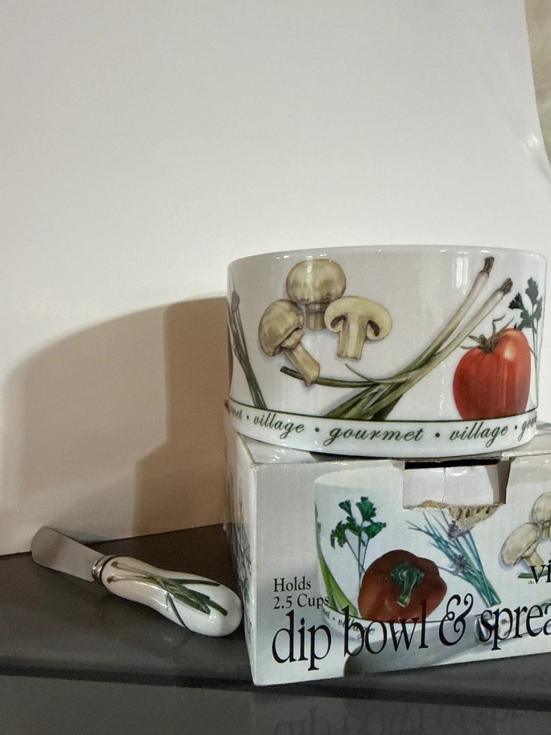 This set includes a ceramic dip bowl and a spreader. The bowl holds 2.5 cups and features a vegetable and herb design. It's perfect for serving dips and spreads at gatherings.