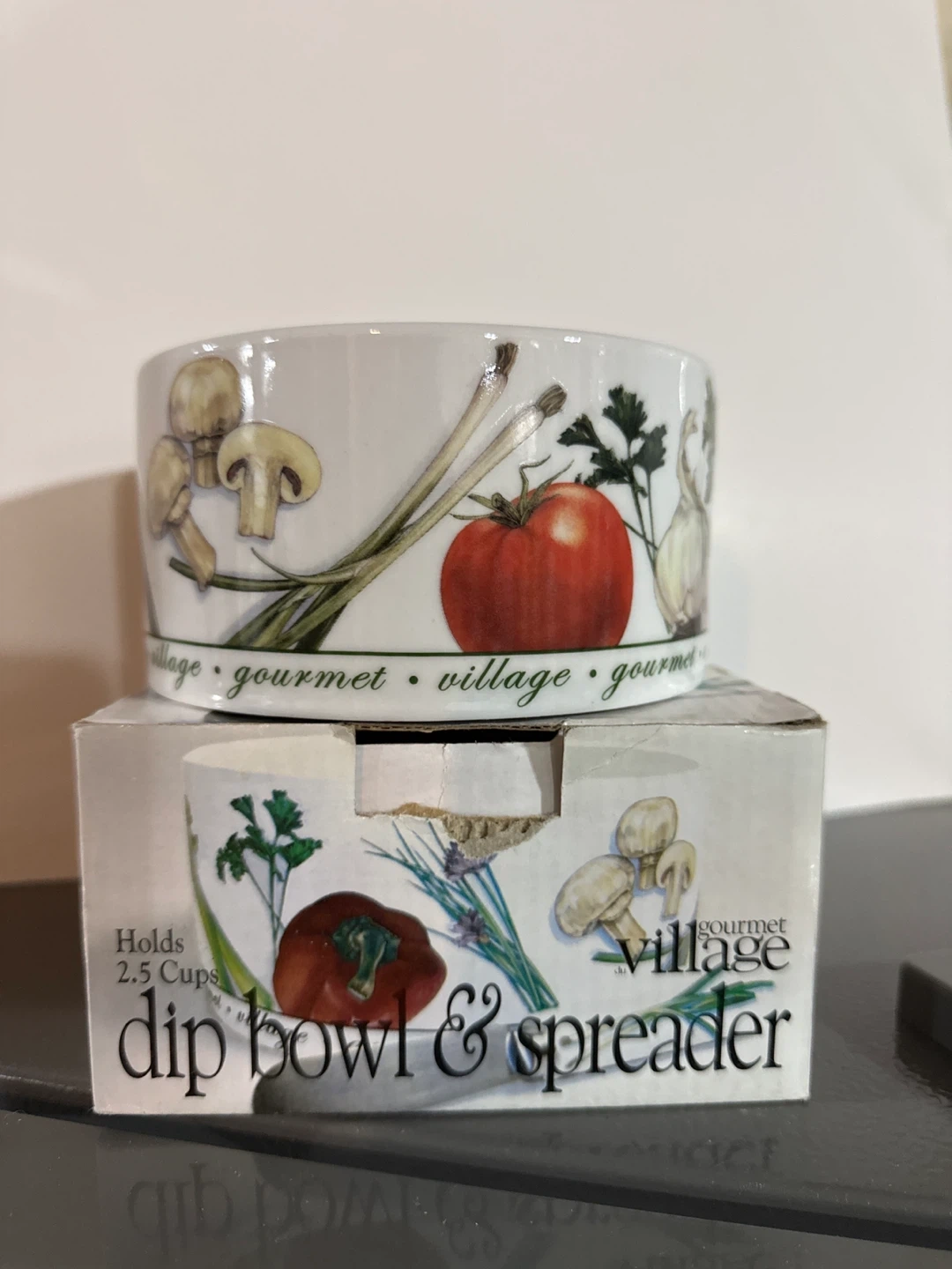 This set includes a ceramic dip bowl and a spreader. The bowl holds 2.5 cups and features a vegetable and herb design. It's perfect for serving dips and spreads at gatherings.