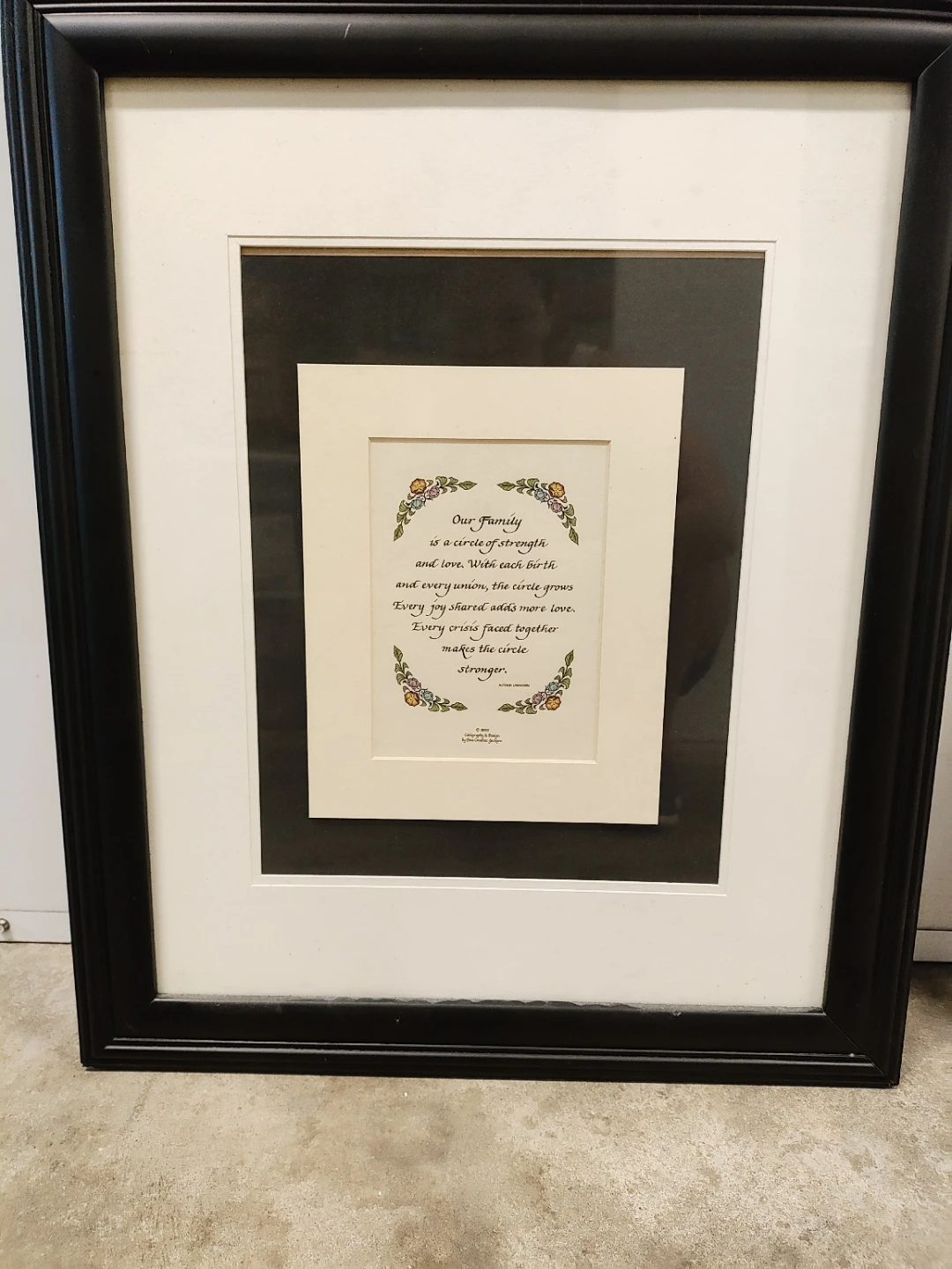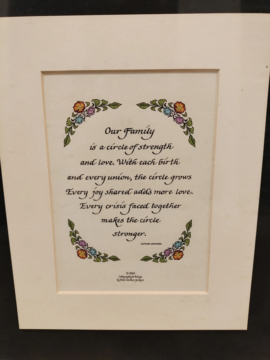 This framed art piece features a heartwarming quote about family strength and love. It's beautifully calligraphed and includes floral decorative elements. The quote reads, "Our family is a circle of strength and love. With each birth and every union, the circle grows. Every joy shared adds more love. Every crisis faced together makes the circle stronger."