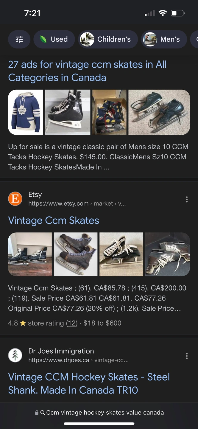 Vintage CCM Hockey Skates Made in Canada. See photos and for retail value . Selling them for 30they are sold much higher in price and these are in perfect condition compared to the ones I saw being listed at higher prices