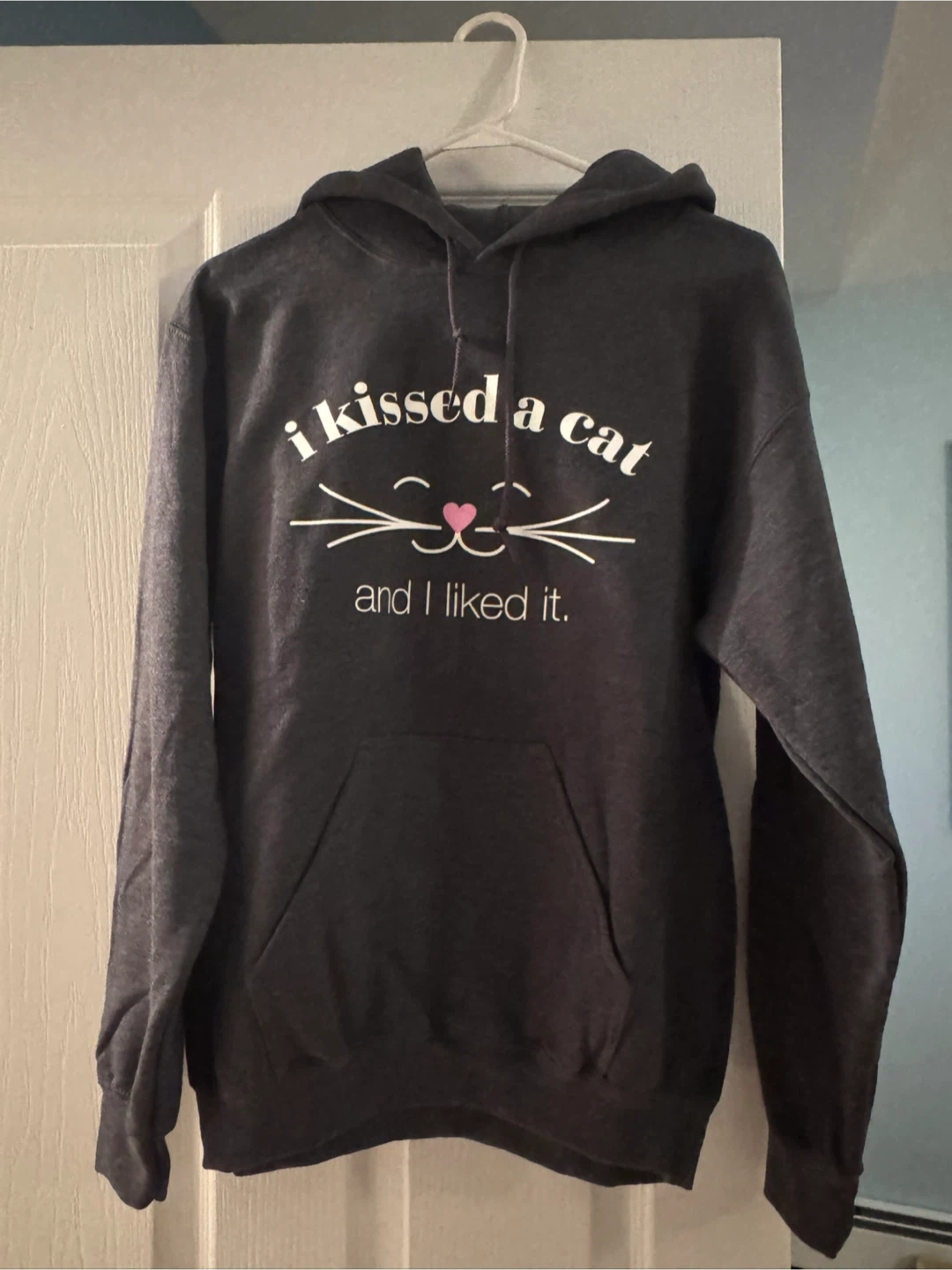 This Gildan Heavy Blend hoodie features a "i kissed a cat and I liked it" graphic. It's a comfortable, dark gray hooded sweatshirt with a front pouch pocket. The material is a heavy blend for warmth.