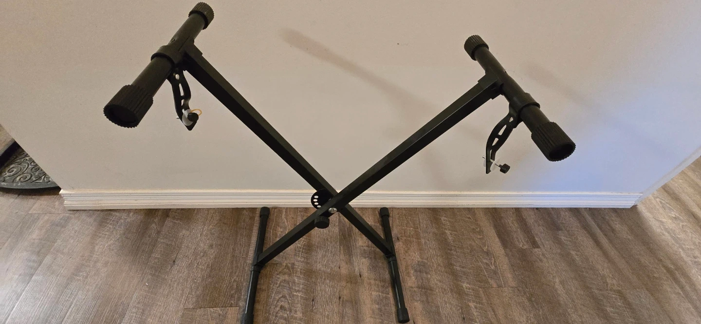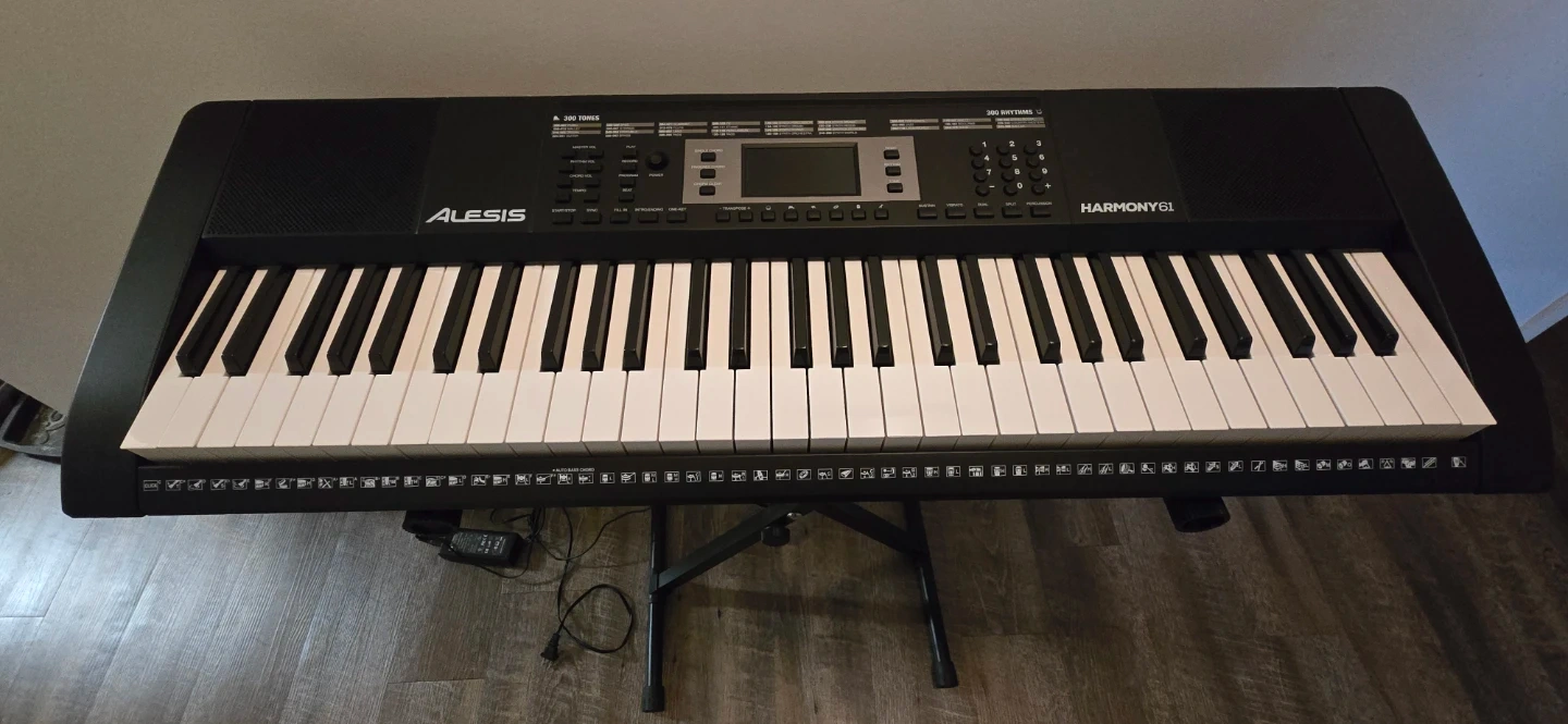 This is an Alesis Harmony 61 keyboard with a foldable stand. It features 61 keys and a digital display for settings. The keyboard is black and comes with a metal X-style stand.