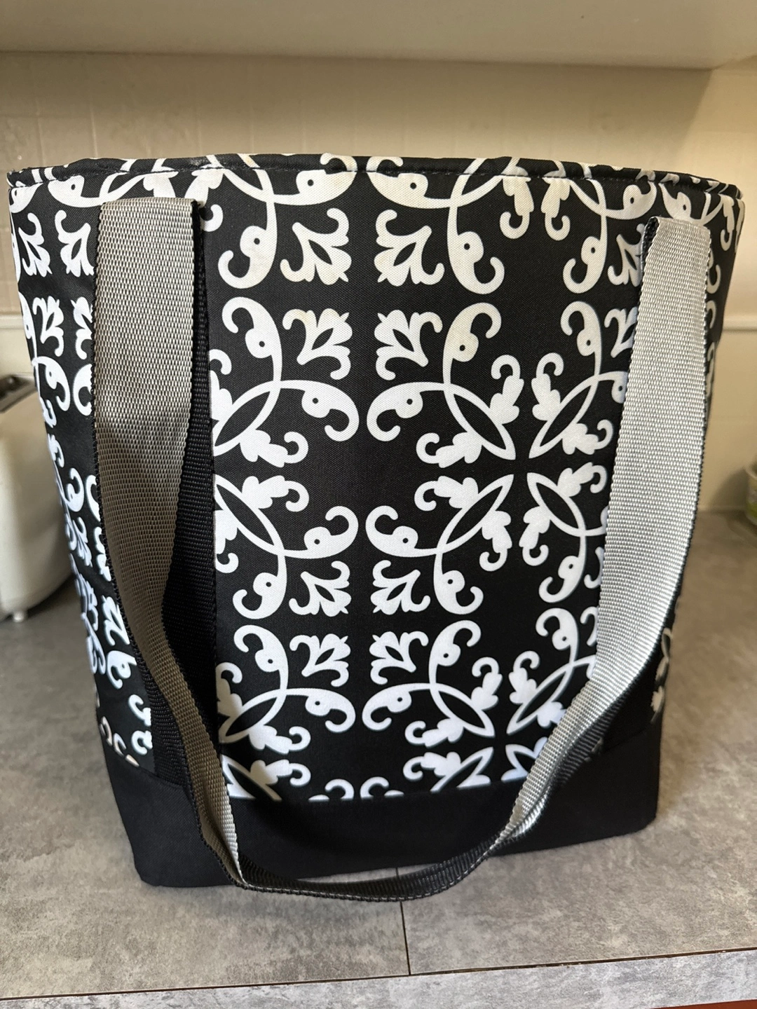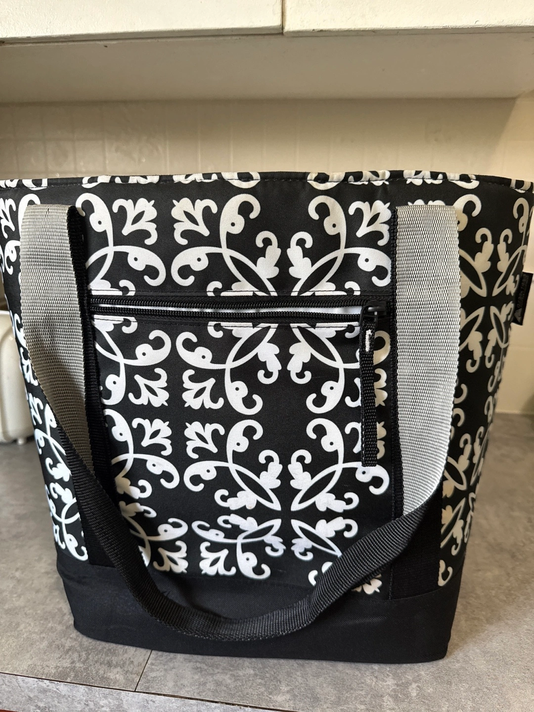 A very stylish tote bag. Made with a patterned outer layer, and the handles are neutral. Take it with you wherever you need a little extra storage.