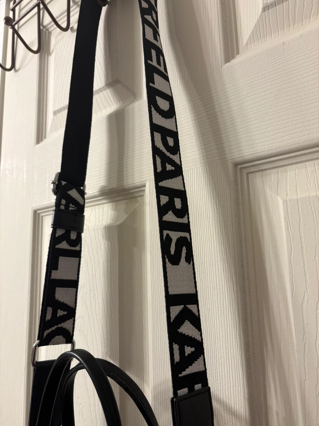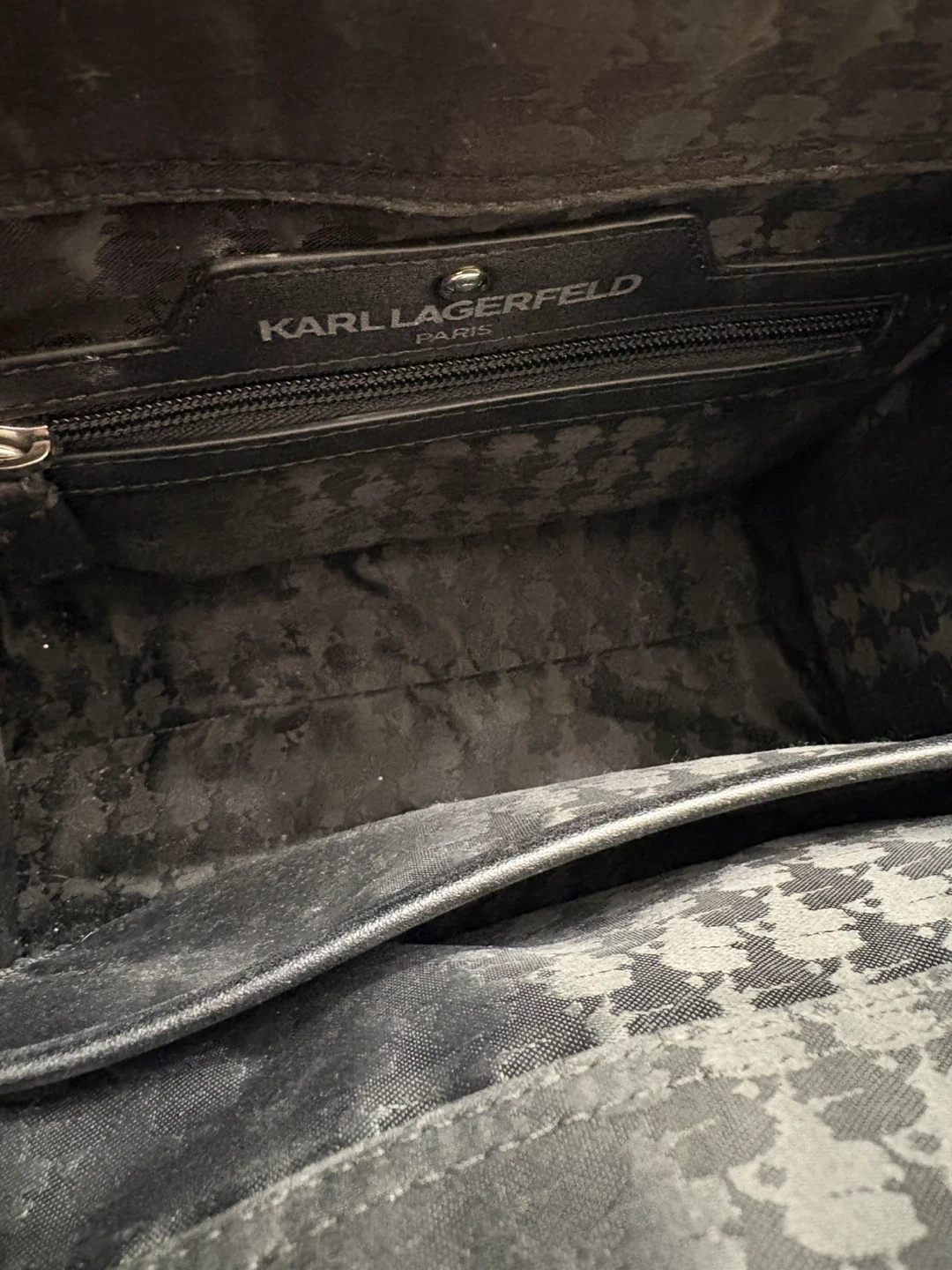 Stylish black shoulder bag by Karl Lagerfeld. It features a pebbled leather exterior and a removable crossbody strap. This bag is perfect for everyday use or for carrying your essentials in style! Great condition, pick up in Chestermere.