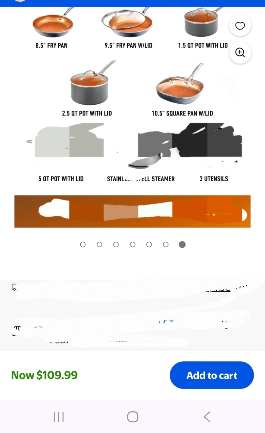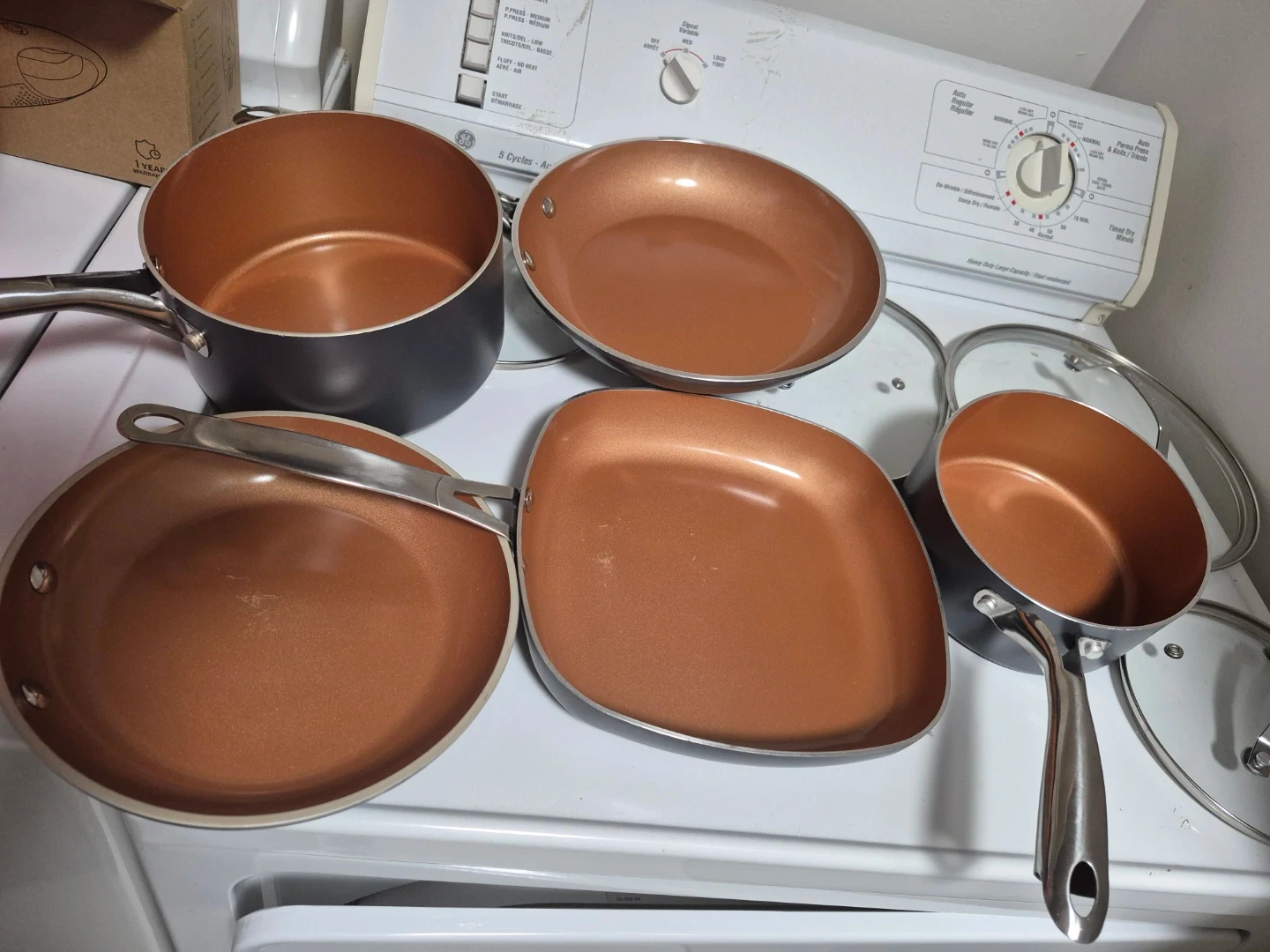 This Copper Chef cookware set includes an 8.5" fry pan, a 9.5" fry pan with lid, a 1.5 qt pot with lid, a 2.5 qt pot with lid, and a 10" square pan with lid. The cookware is stainless steel and dishwasher safe. It's great for everyday cooking needs!