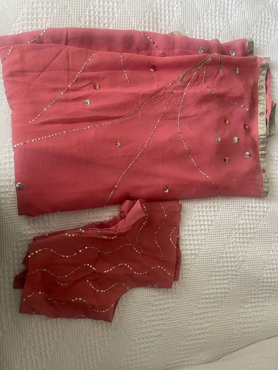 Selling a beautiful chiffon cutwork sari with delicate embellishments! The fabric has a lovely drape and the detailing adds a touch of elegance. Perfect for a special occasion or cultural event