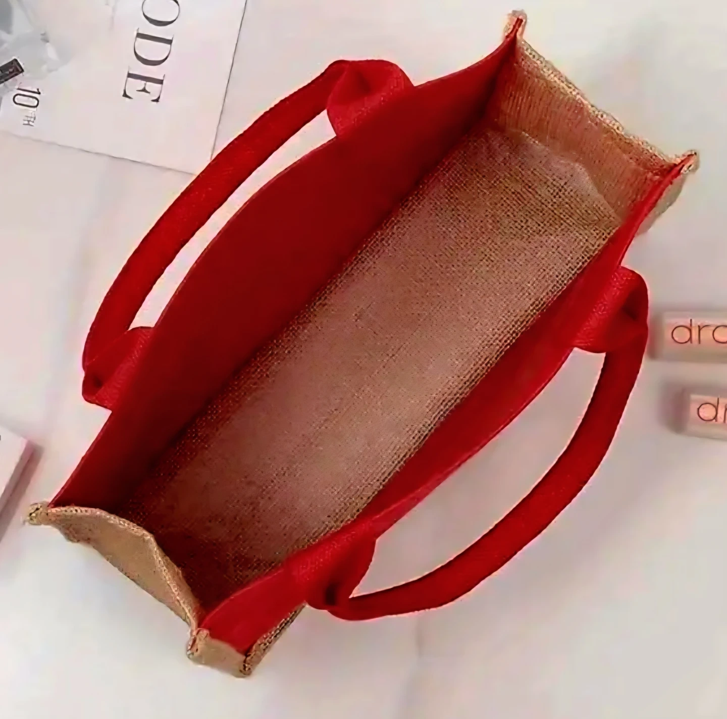 This red jute tote bag features a "Simply Blessed" graphic. It's made of durable jute material with a burlap trim. The interior is also lined with jute material. This bag is great for everyday use or as a gift!