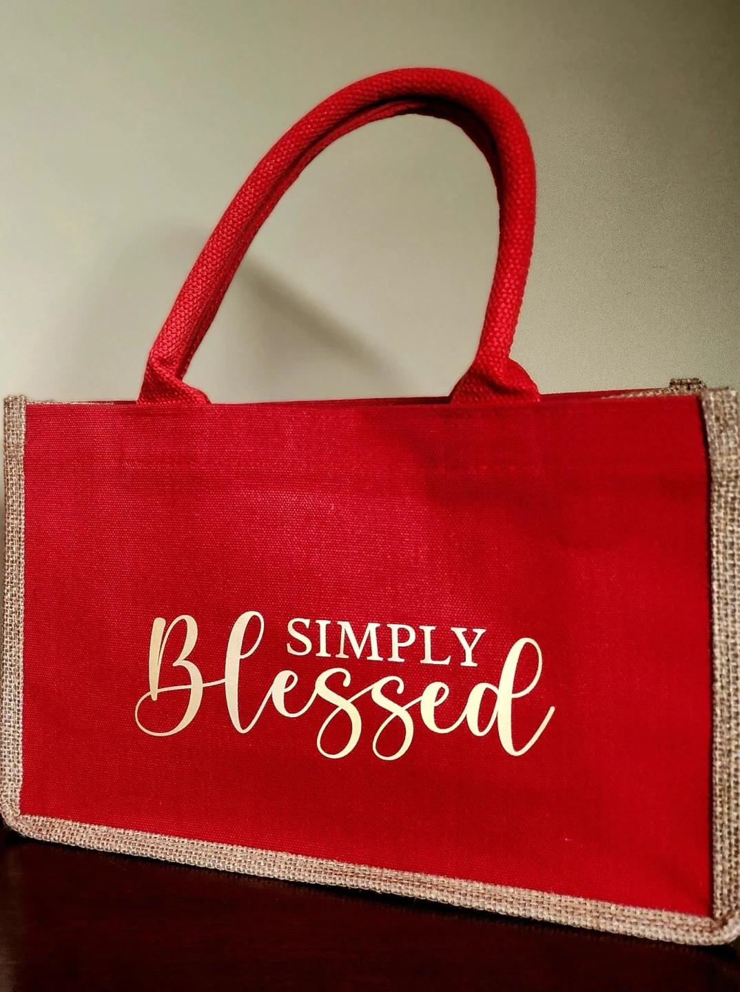 This red jute tote bag features a "Simply Blessed" graphic. It's made of durable jute material with a burlap trim. The interior is also lined with jute material. This bag is great for everyday use or as a gift!