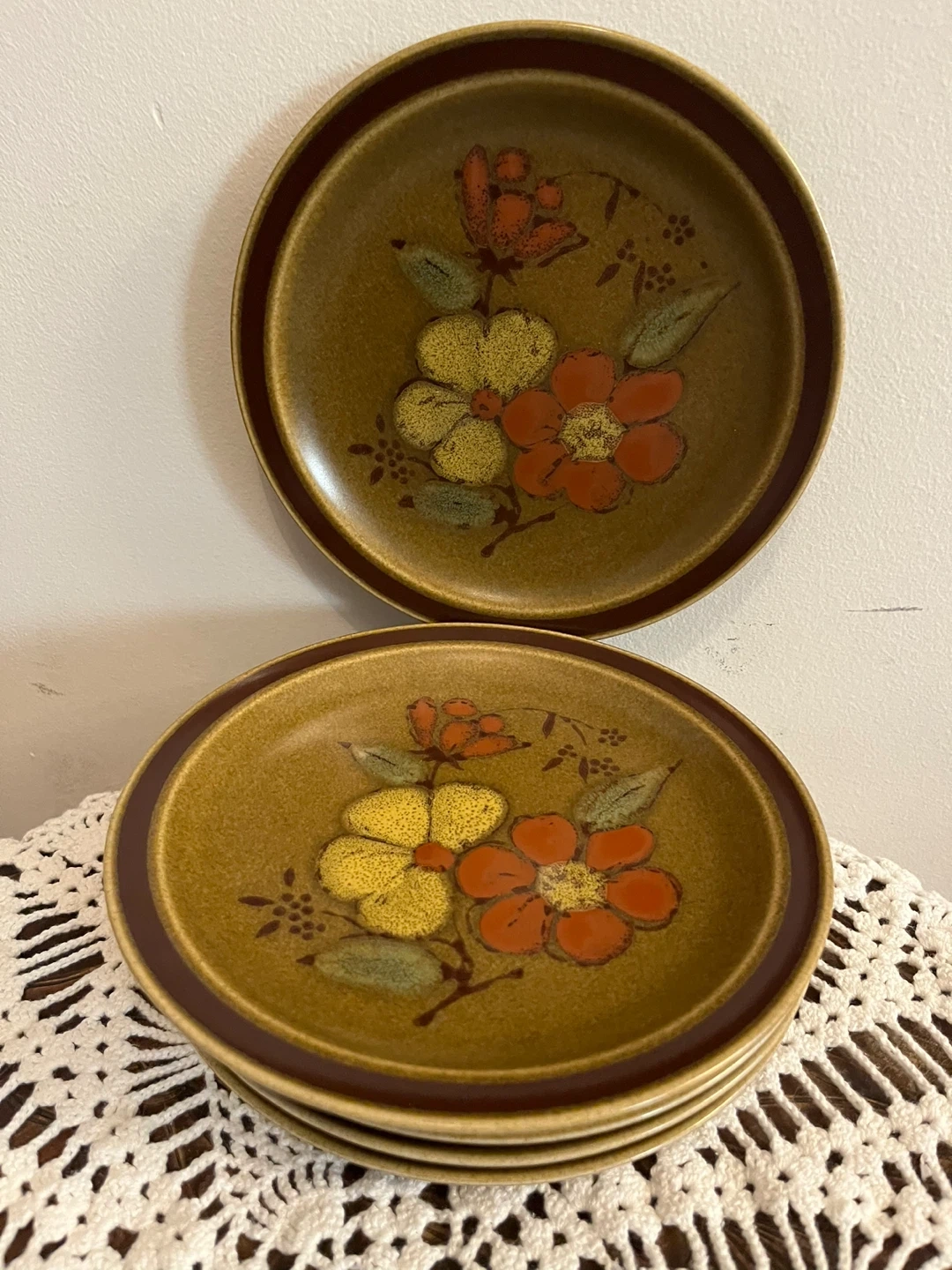 Set of 6 saucers “Lilliana”featuring a vintage floral design. The plates have a warm brown rim and a tan base with orange and yellow flower accents. They're perfect for adding a touch of retro charm to your table setting. Made in Japan. No cracks. No chips.