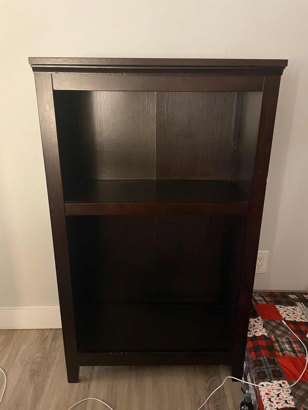 Dark brown wood bookcase with one adjustable shelf. You can adjust the height you prefer or add another one (not included). In good very condition, with some minor scratches.