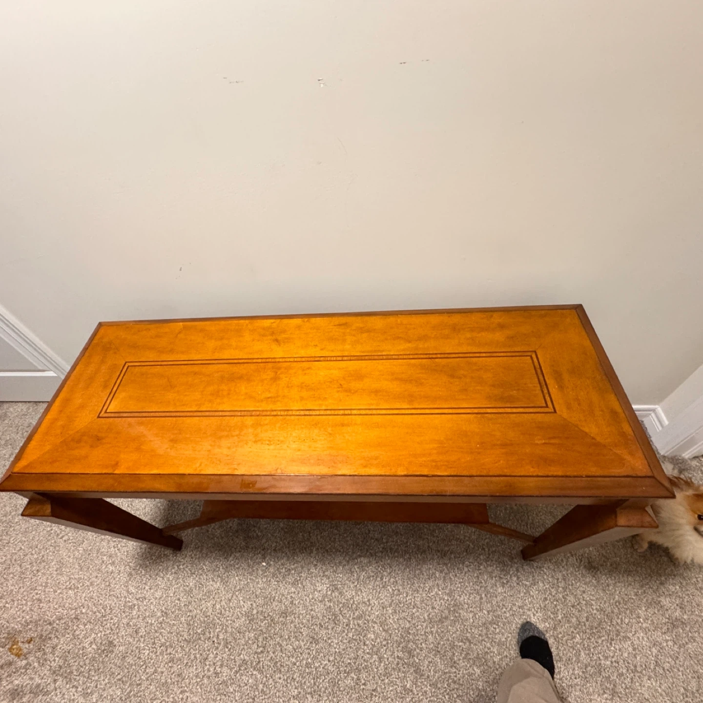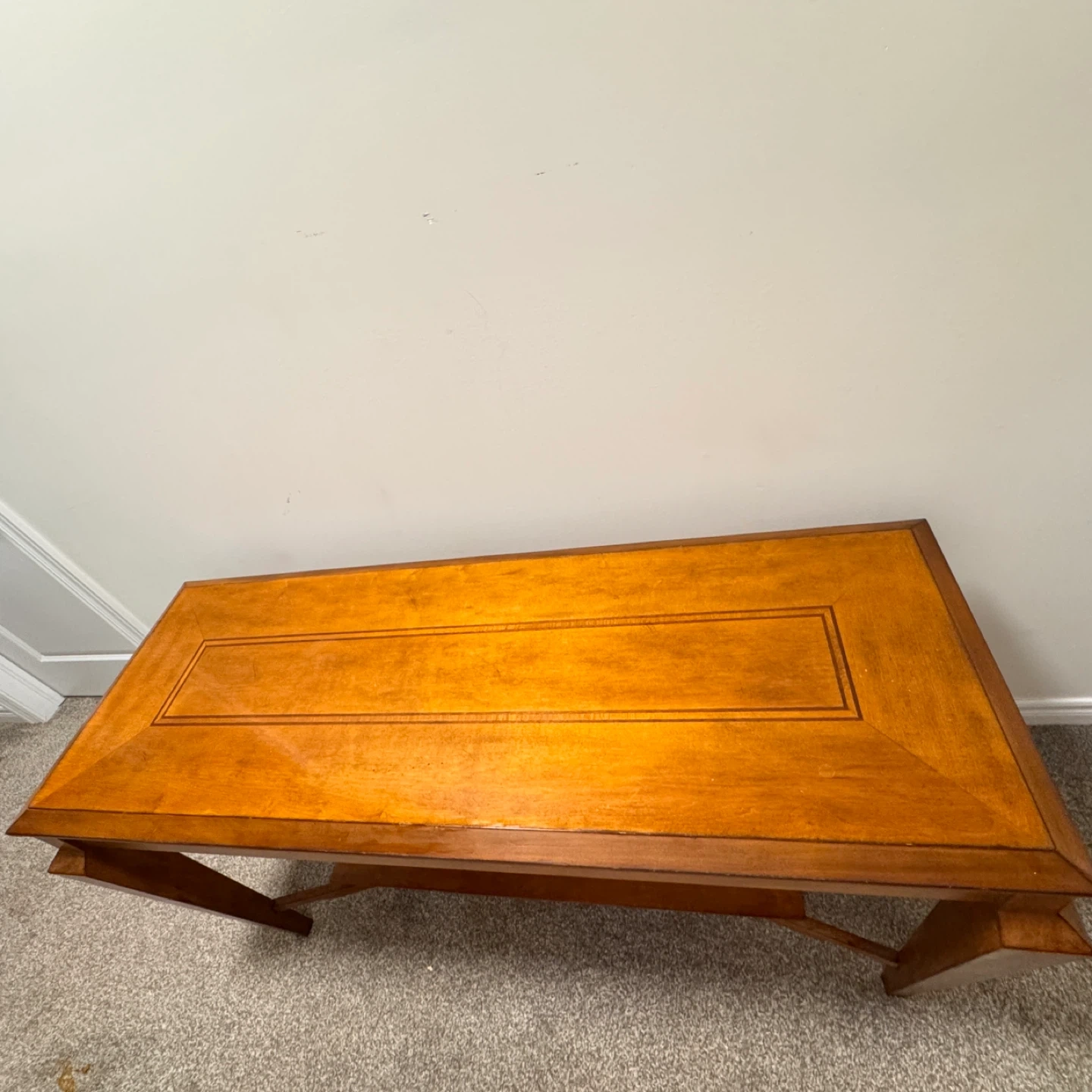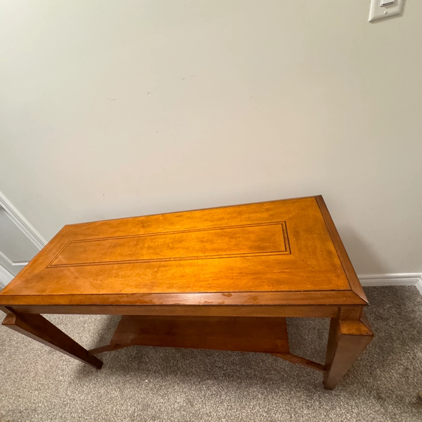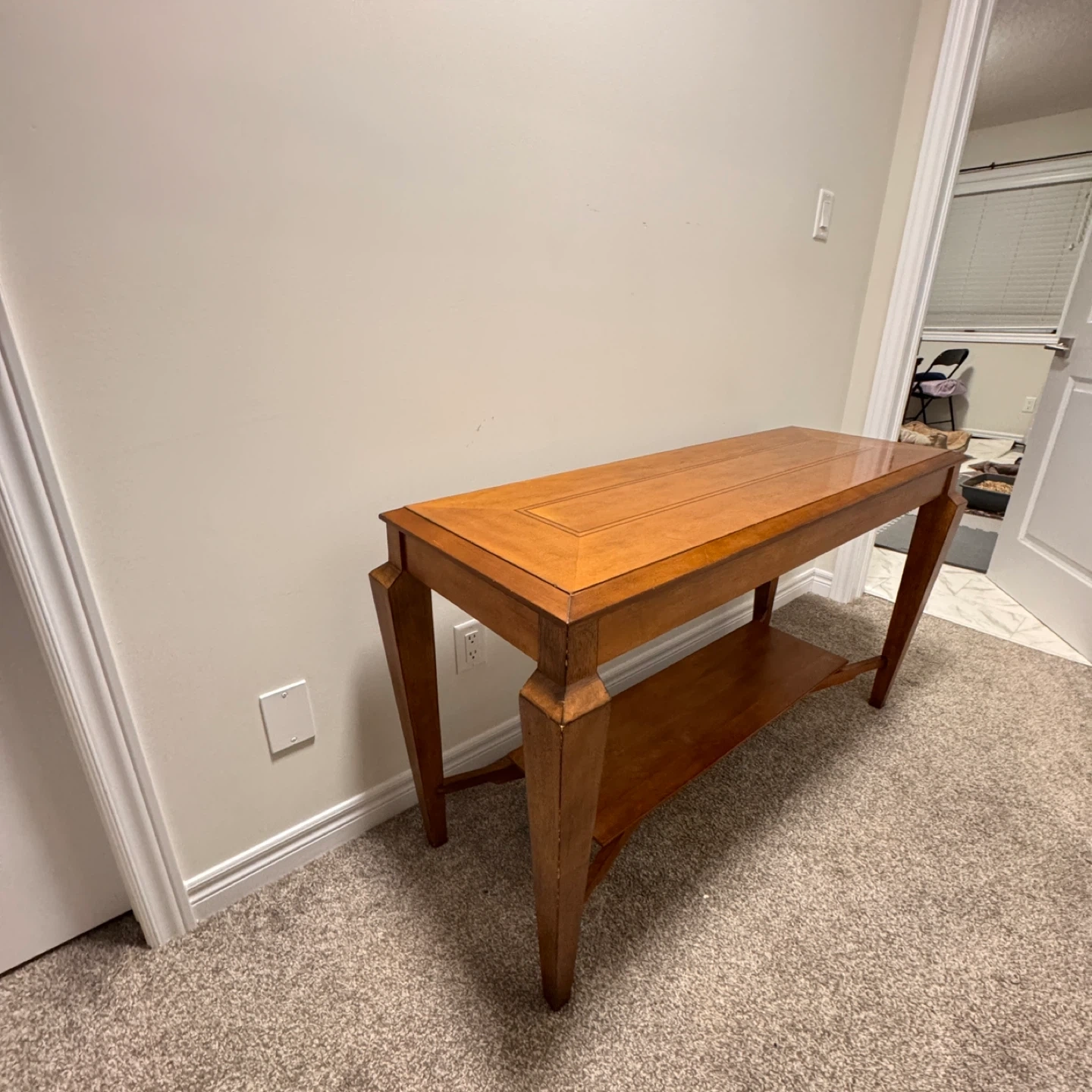 Buy & SellWooden Console Table with ShelfWooden Console Table with Shelf$187This is a wooden console table with an inlaid top detail. It features a lower shelf for extra storage. Wood construction with a warm finish.ConditionLike newWHERE TO MEETCheck LocationView MapSELLERverifiedCarmenSt. Jacobs600 reviews0 chats·0 favorites·8 viewsSEND CHAT TO SELLERHi Carmen! I’m interested in your listing.Hi Carmen! I’m interested in your listing.Get the Karrot app to chatSign In to chat