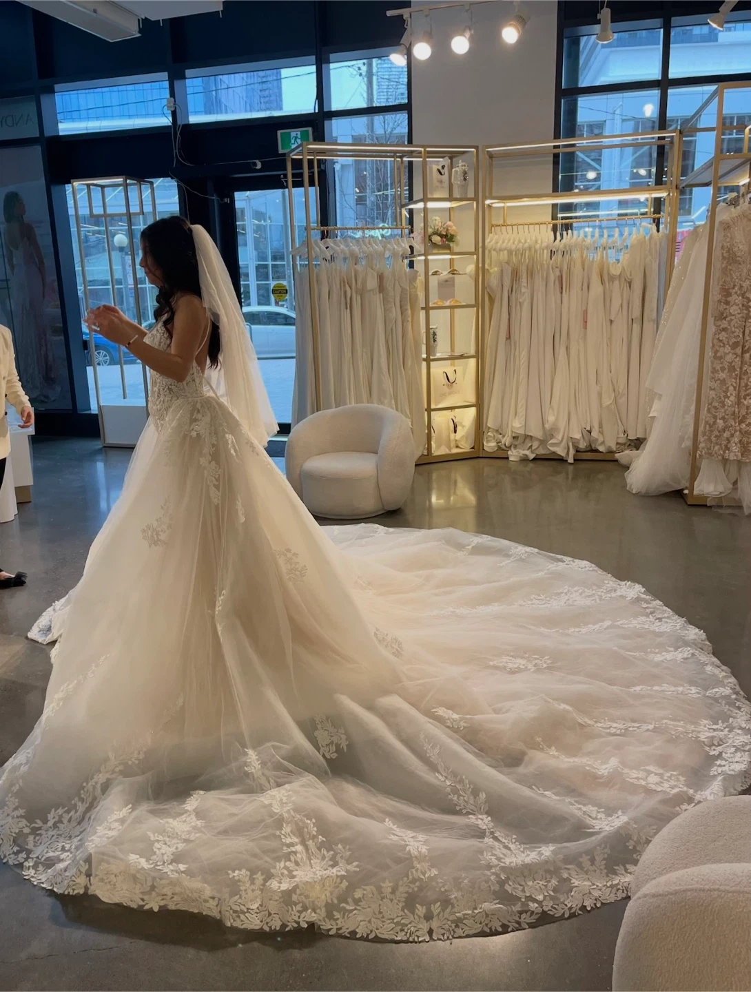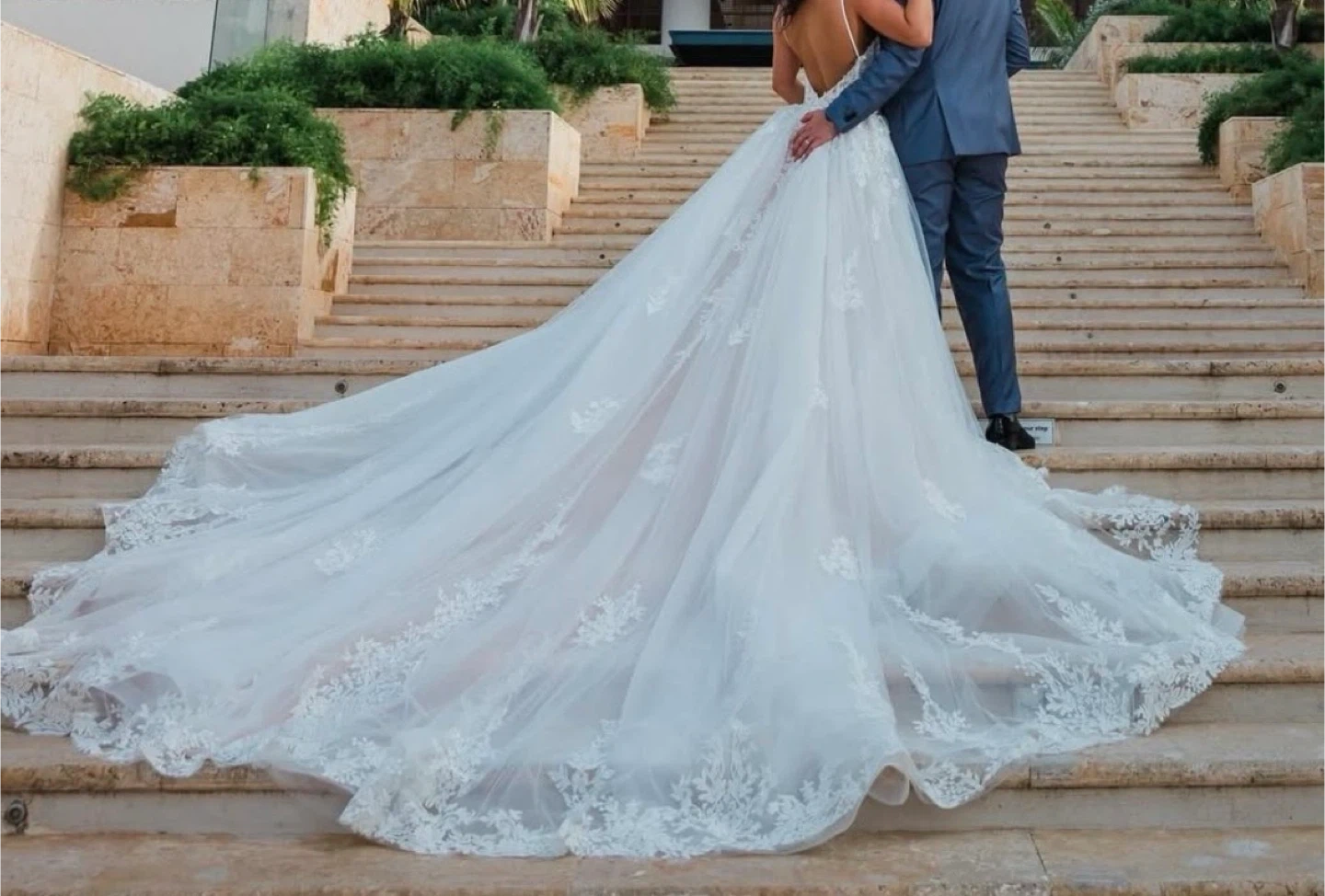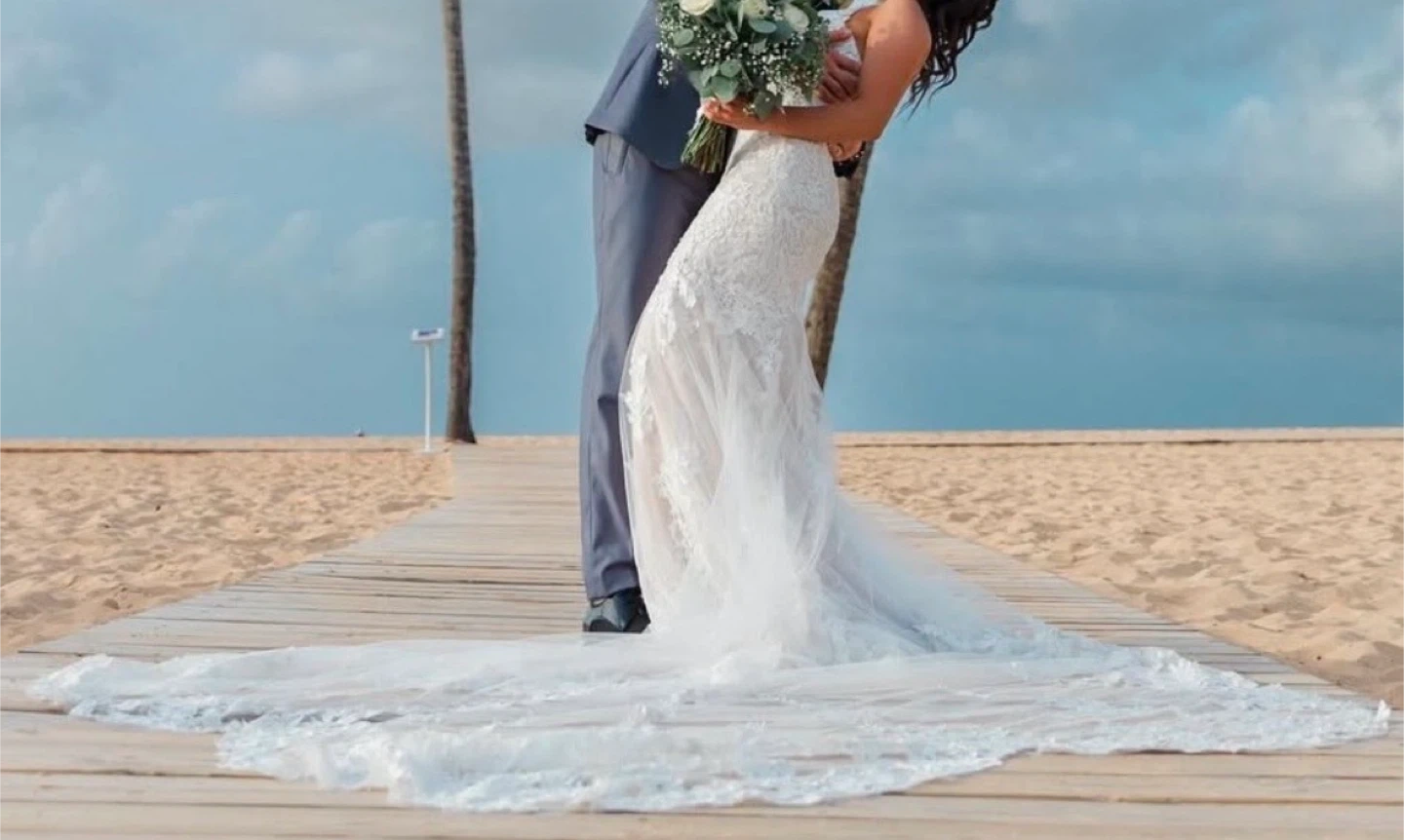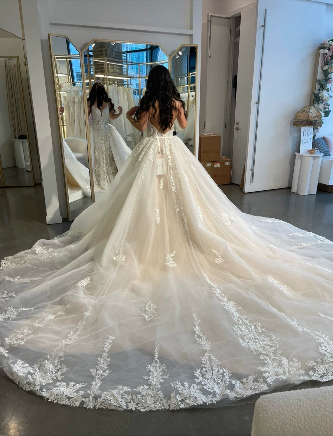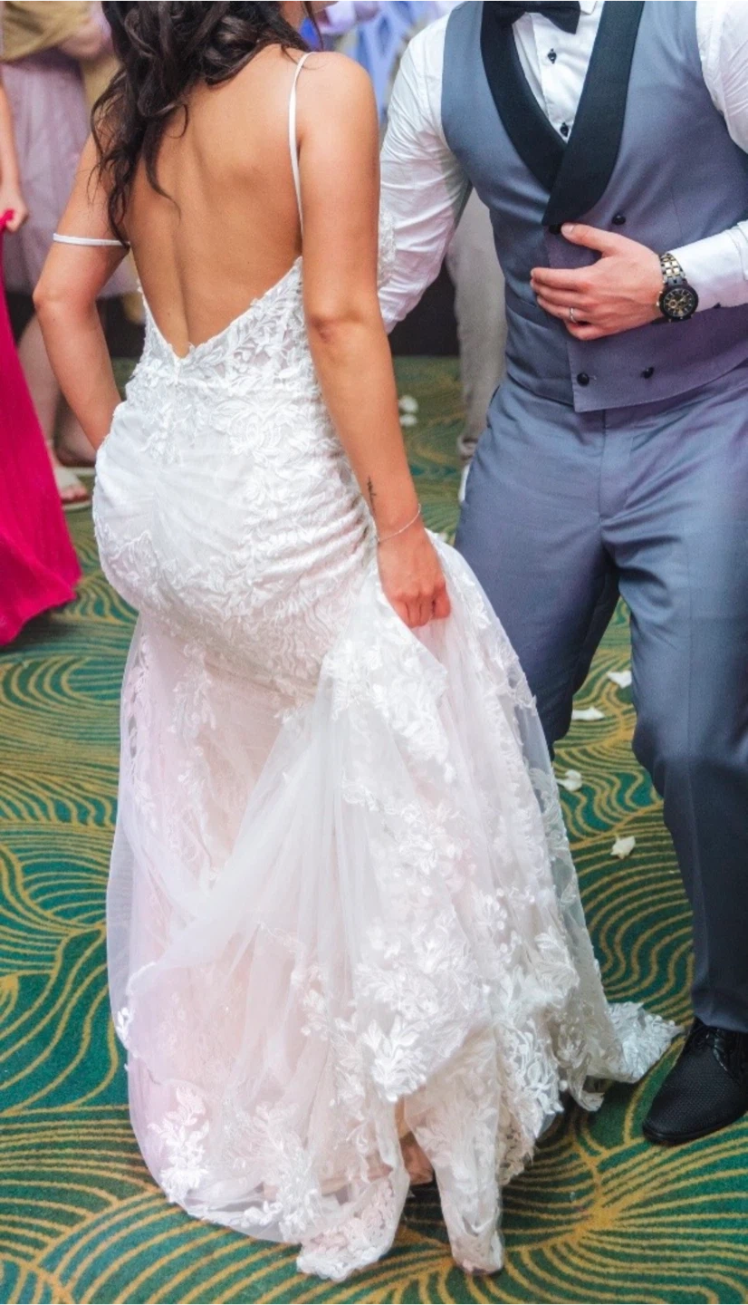 2 in 1 lace mermaid wedding dress with a sweetheart neckline and a dramatic train. Intricate floral lace detailing throughout. Lace-trimmed hem. Fully lined. (detachable over skirt)
